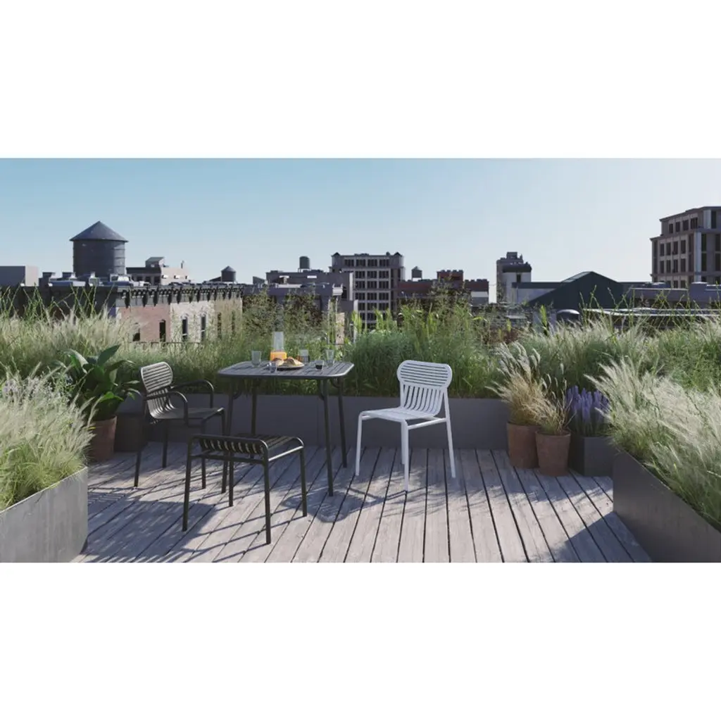 The Week-end stool is part of Petite Friture’s collection of aluminum outdoor furniture. The clean-lined outdoor stool goes beautifully together with the tables and benches of the Week-end collection, and also serves as a small side table itself, if needed. All chairs and stools in the Week-end collection are stackable. Created by the design duo BrichetZiegler, Petite Friture’s Week-end outdoor furniture combines different geometrical shapes with functional, contemporary design. The aluminum structure makes the pieces lightweight and hardwearing at the same time, and the epoxy-coated matt surface can easily stand any weather. The Week-end range consists of chairs, benches and tables in many colors and sizes, and is thus suitable for large gardens and small balconies alike. Thanks to the sleek design, the pieces can also be used indoors.