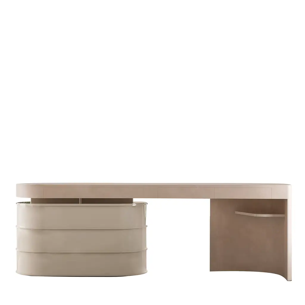 The Weiss Console Table is a gorgeous piece that masterfully blends utility and style. Crafted from oak wood in a white-washed finish, the piece features two open-air shelves on each side that provide a significant amount of storage space. The console table comes included with two ottomans upholstered in Nomad Snow 1109 and Highland Ivory-804-2204 fabrics, showcasing striped patterns in alternating neutral tones.