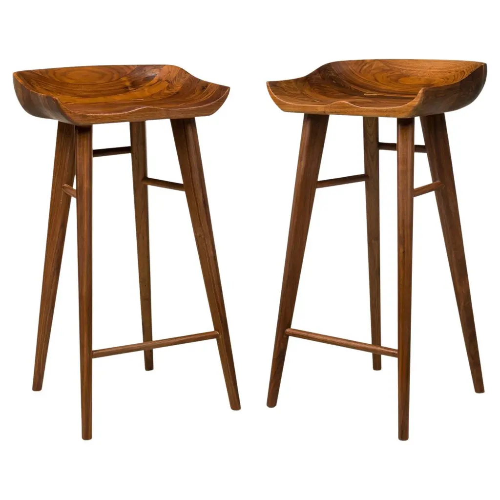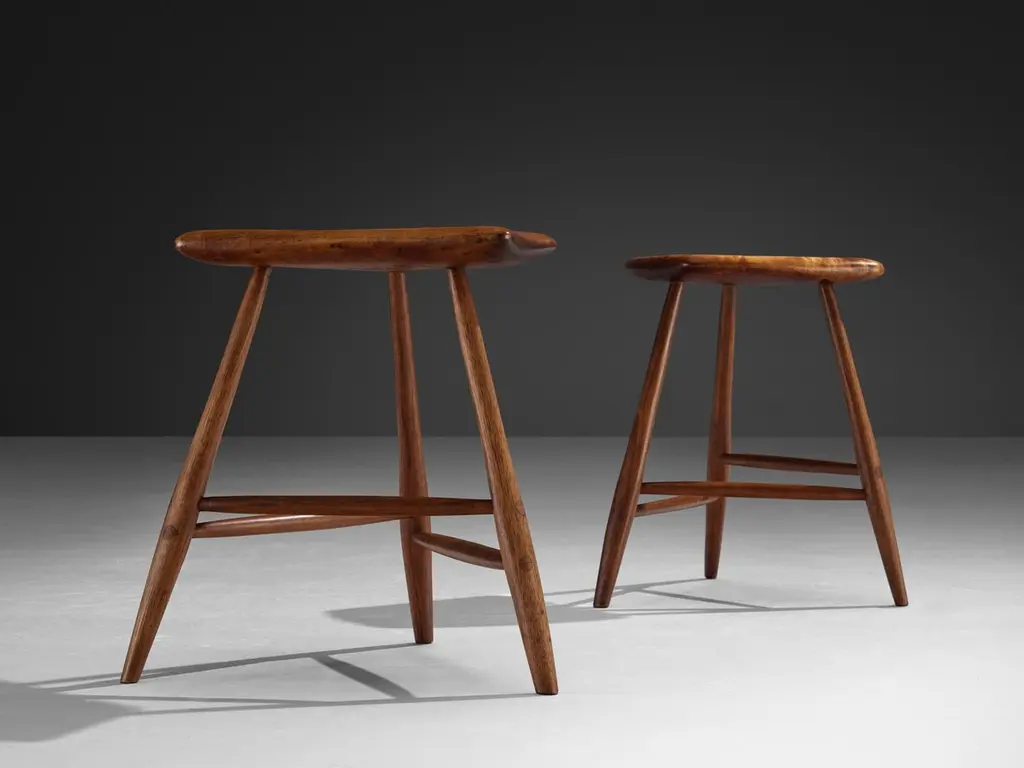 Wharton Esherick, stools, cottonwood, hickory, United States, 1954This beautiful three-legged stool is a striking example of American designer Wharton Esherick’s oeuvre. The resurgent interest in handmade furniture during the mid-century period inspired Esherick to expand his oeuvre and to produce small, readily pieces beside his commissions. He used leftover wood scraps with an interesting grain figure to create three-legged high and low stools. He let the wood’s grain determine the final shape of the seating, which were all made by hand. The legs of the stools were executed in a slender manner to assure a lightweight and elegant appearance. On the bottom of the seating the stool has the year “1954” engraved as well as the designer’s initials. One of its essential details is the carved deepening of the seat, exemplifying Esherick’s keen eye for detail and expert craftsmanship. Due to the sleek and tapered features of the legs and the organic seating, the chair has an airy and dynamic allure. American artist, furniture designer and pioneer of the Studio Craft Movement Wharton Esherick (1887-1970) studied printmaking and drawing at Philadelphia School of Industrial Arts (now the University of Arts) and Pennsylvania Academy of Fine Arts. In the late 1920s Esherick guided his focus towards the design of wooden furniture. His attention to wood was evoked by the creation of illustration woodcuts. Esherick then discovered his passion for wooden sculptures and finally also furniture which he usually just made once. With the acquisition of his works by the Whitney Museum in New York, Esherick found confirmation of his talent with wooden objects. His oeuvre ranges from Arts & Crafts to Cubism and Expressionism. In 1912 he and his wife moved to rural Paoli in Pennsylvania where they settled down for the rest of their lives in order to live a lifestyle more immersed in nature. The old farmhouse got dedicatedly extended by Esherick himself. Today, it hosts the Museum of Wharton Esherick, which allows you to admire his designs in the original setting.The listed price is per item.