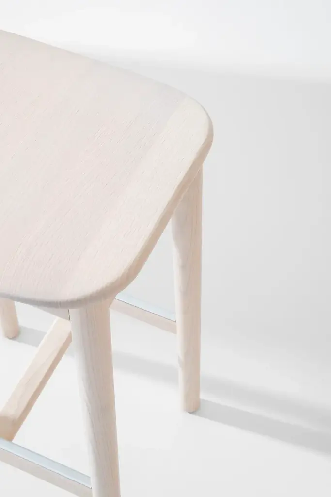 White 134 is a high stool with a footrest, featuring an ash wood frame.White is a collection inspired by the Nordic design of the 1960s. The White chair, heir to Billiani’s Green chair, also resembles it in name.Both feature generous forms and legs four centimeters thick, but White is even more robust: a chair with a reassuring presence, ideal for any setting where solidity and comfort are essential.