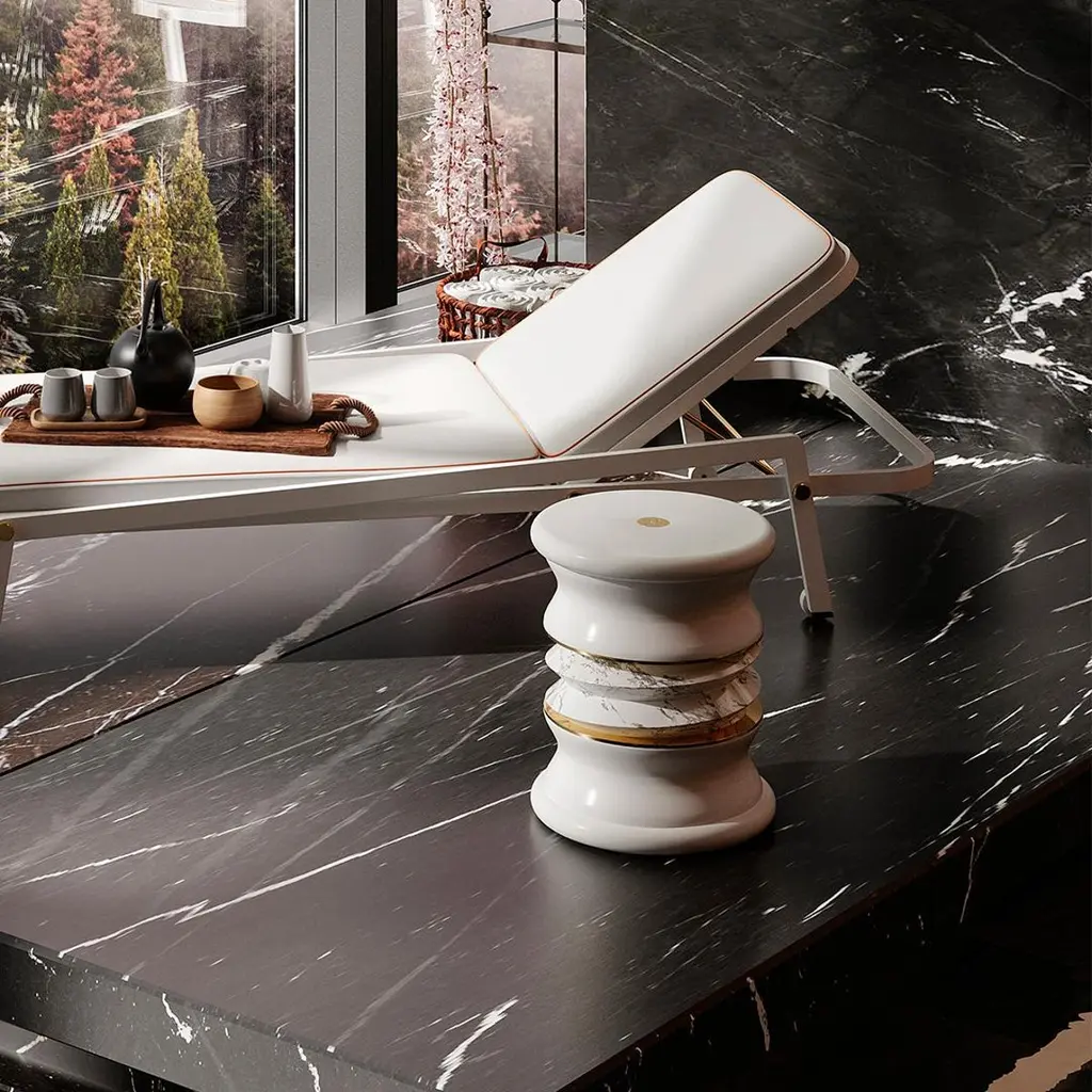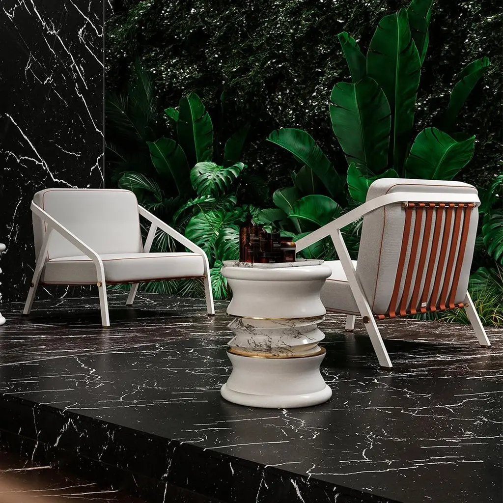 The Lonian stool embodies the timeless elegance of Greek architecture, reimagined with modern precision. Its sculptural shape and fluid lines create a perfect balance between classic design and contemporary simplicity. Made of fiberglass, with marble and metal details, it is the true fusion of architectural beauty and functional design.The whole design of this contemporary Lonian outdoor stool was developed according to the following structure:-Base: Fiberglass;-Top: Fiberglass;-Middle: Outdoor marble;-Details: Gold-plated stainless steel.All Myface materials are from premium suppliers, engineered to offer the best performance possible outdoors.Water, Mold, Mildew, UV, and Fading resistance are some of the characteristics that you can expect from both materials, which are available in a wide array of colors and patterns.Lonian Twist - Outdoor stoolYou can customize your Lonian twist outdoor stool to match the remaining outdoor decor. Some customization options: Myface Black, Myface White, Myface Almond, Carrara Marble, Brushed Stainless Steel, and Copper Brushed among others. Greek architecture is known for its structures and that’s the main inspiration for Lonian. An outdoor stool that's unique due to its shapes and materials. Featuring a fully customizable structure in fiberglass, complemented by marble and metallic details.