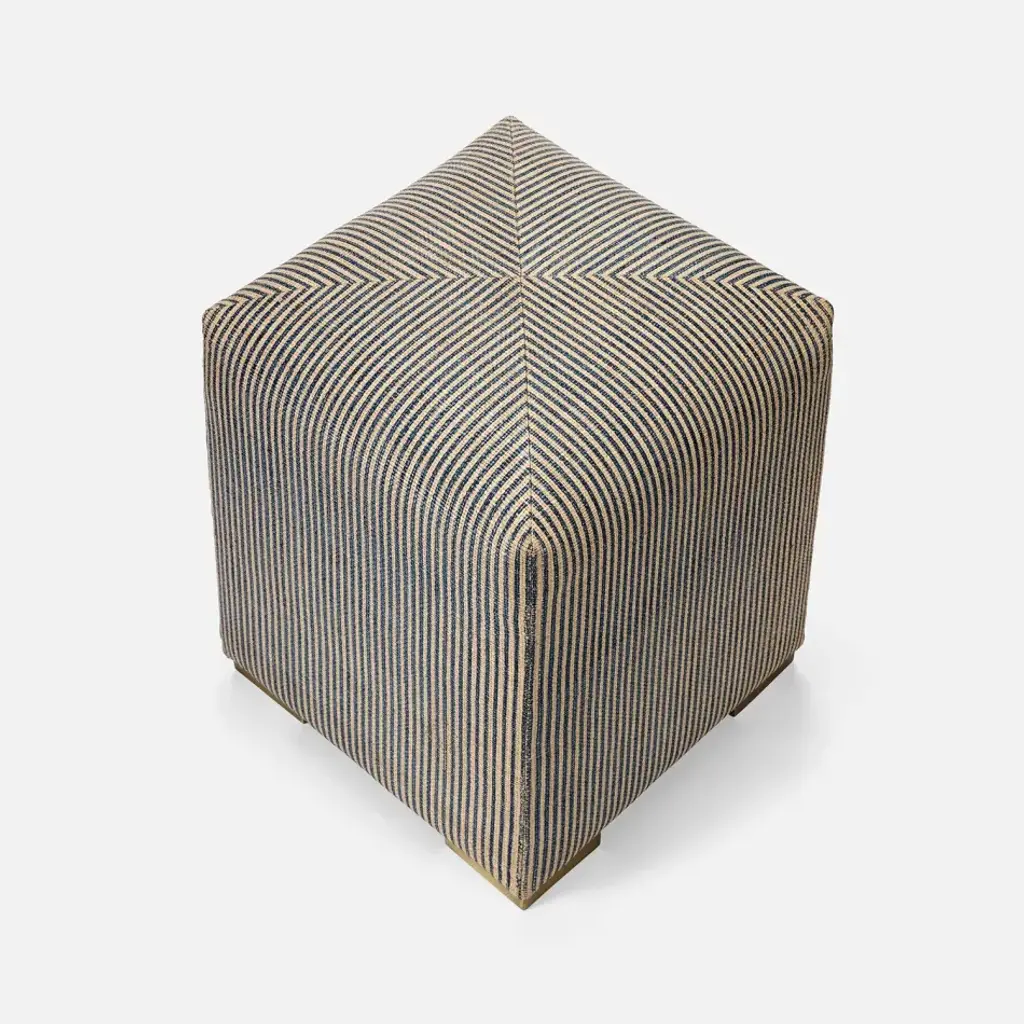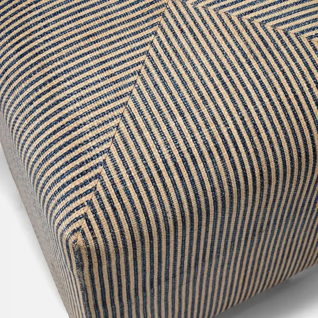 Winslow stool features handwoven raffia in a striking striped pattern. Cushioned for both comfort and durability, these stools make a welcoming ottoman, book table, or spare seat. Natural variation to be expected.