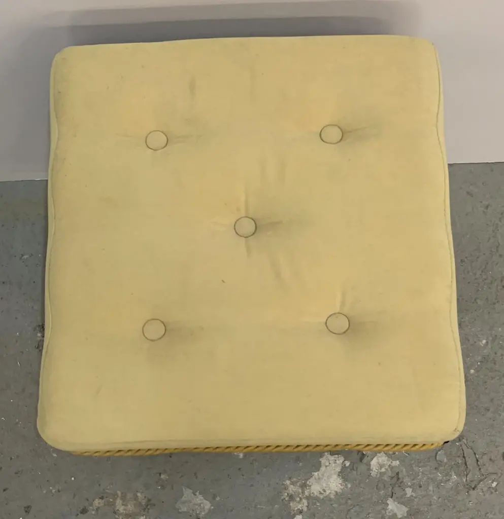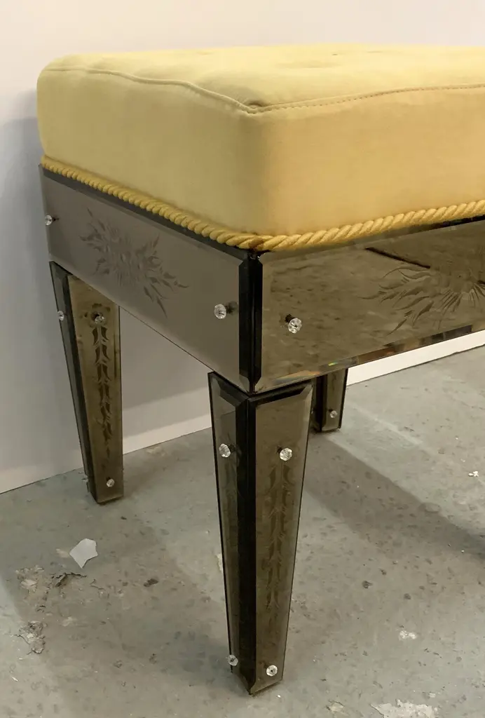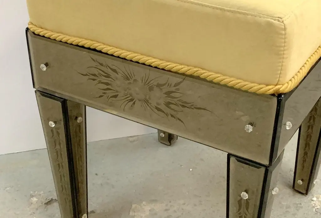 A wonderful pair of vintage Italian Venetian etched mirrored yellow upholstered stools or benchespurchased from Lorin Marsh.