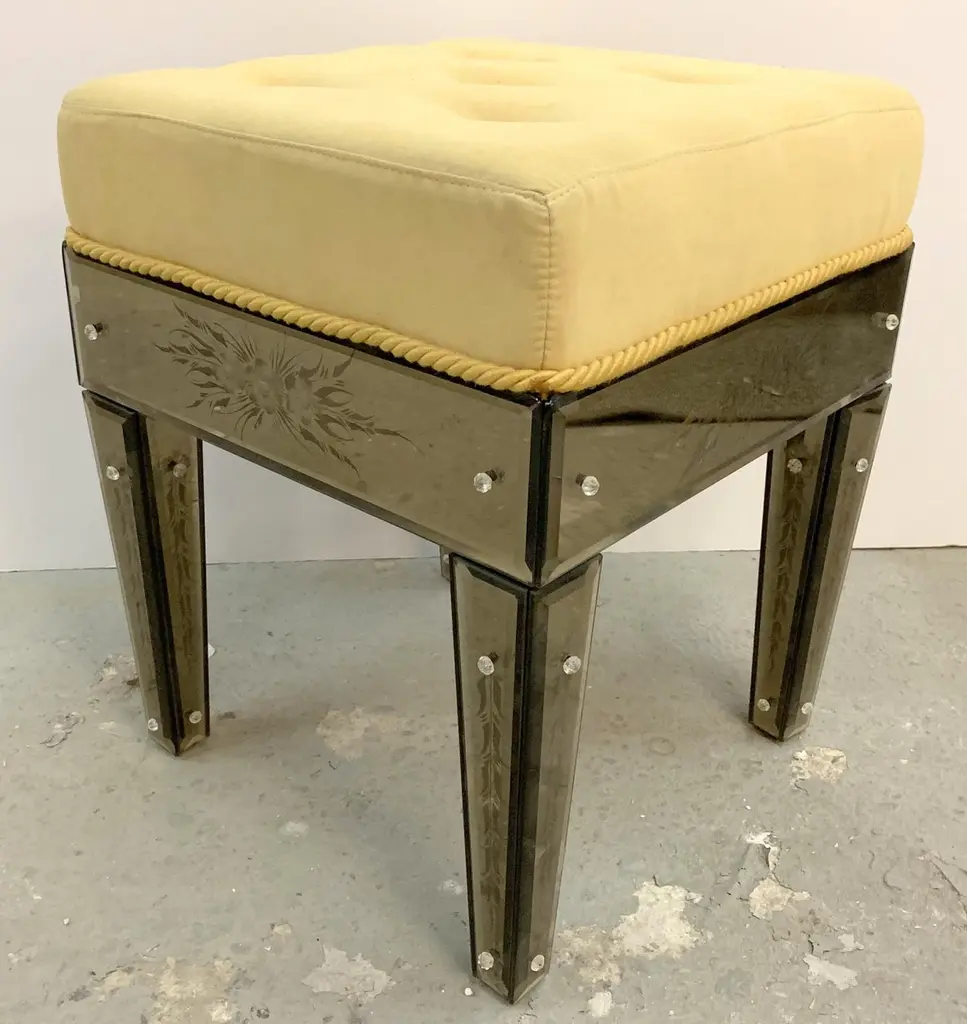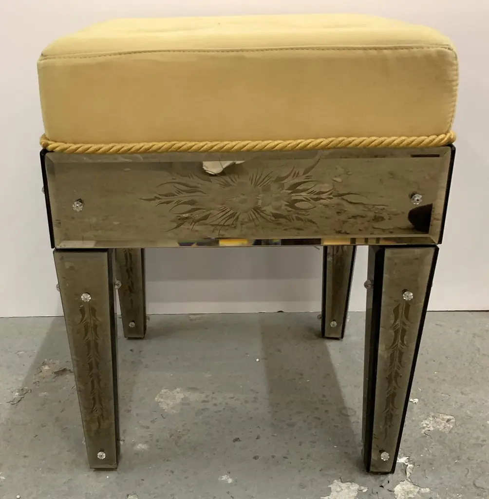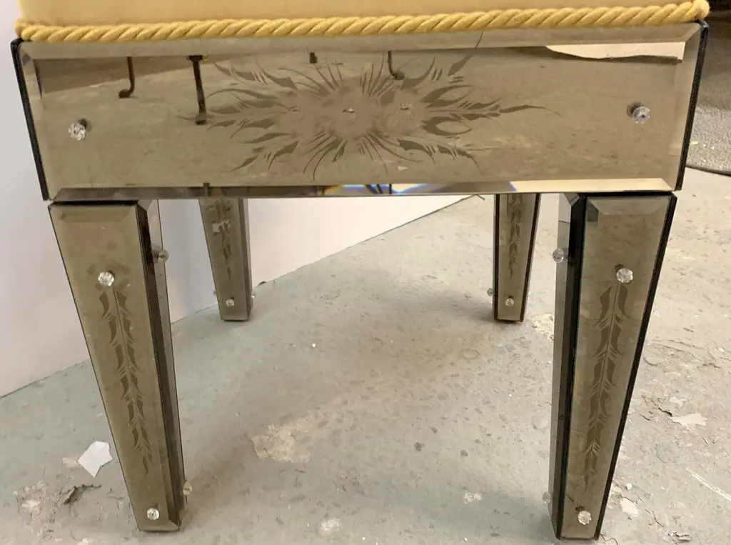 Wonderful Pair Vintage Venetian Etched Mirrored Italian Upholstered Stool Bench