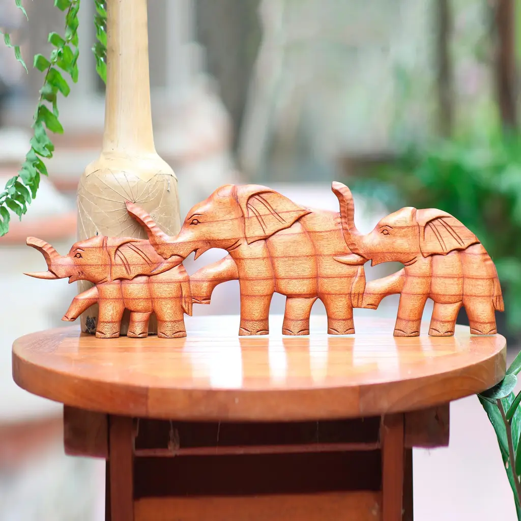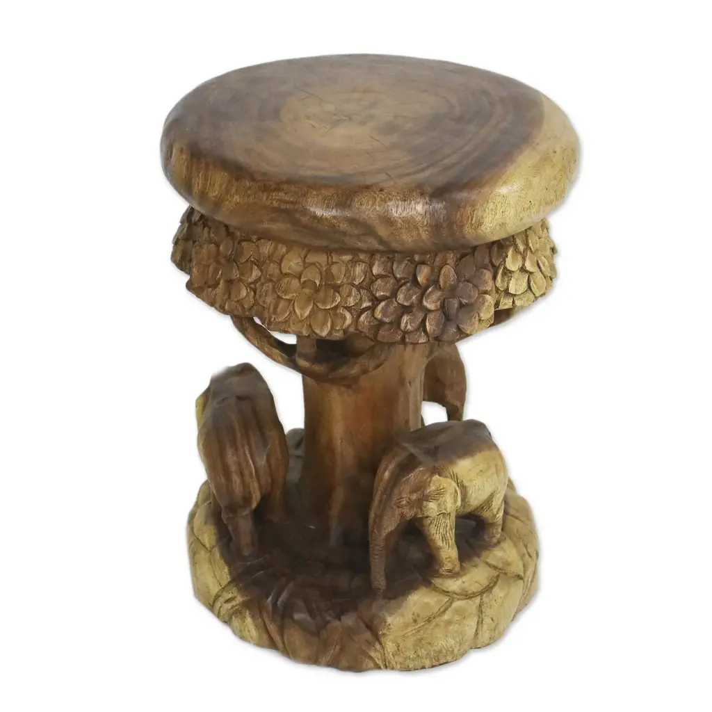 Parading around a tree, three elephants are carved by hand in this raintree wood stool from Thailand. Amporn works with local artisans, who give the stool a finish that accentuates the wood's natural grain.