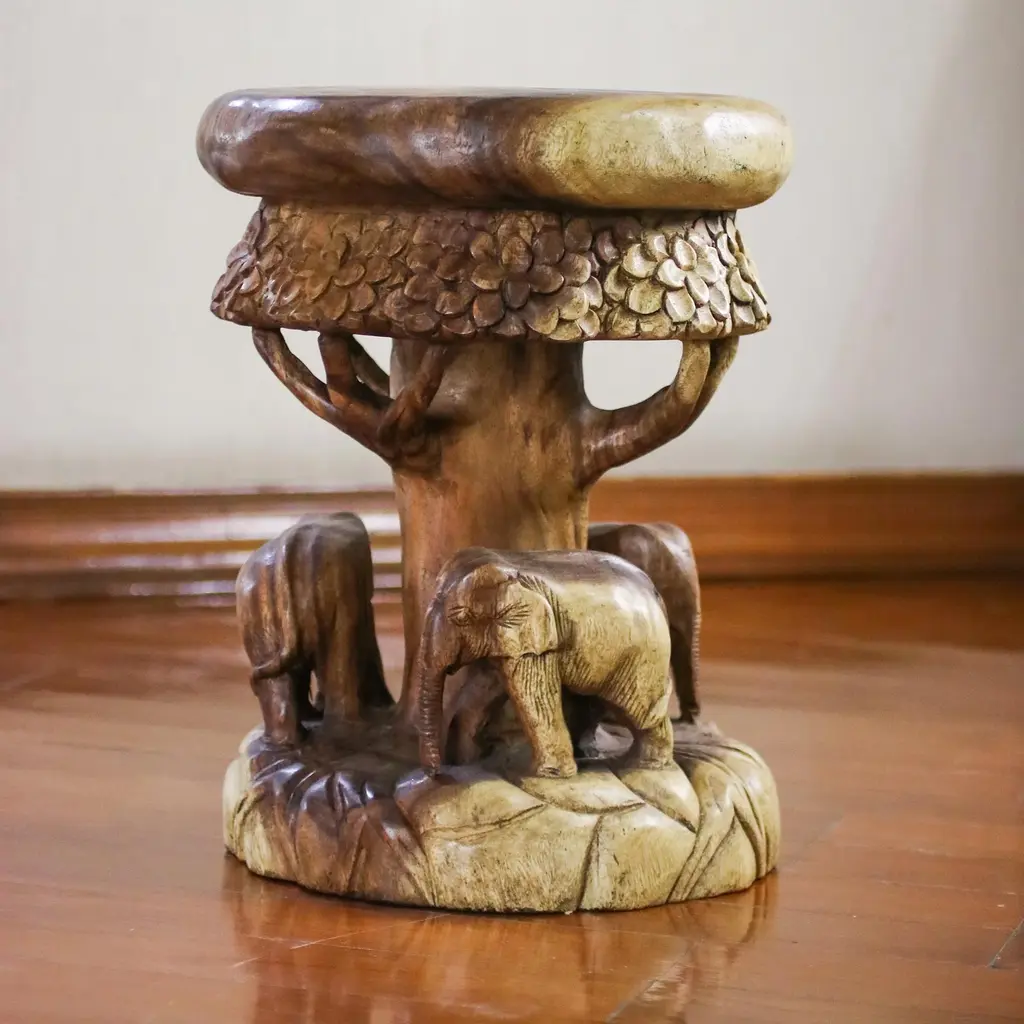 Wood Stool Of Elephants Around A Tree From Thailand- Around The Tree