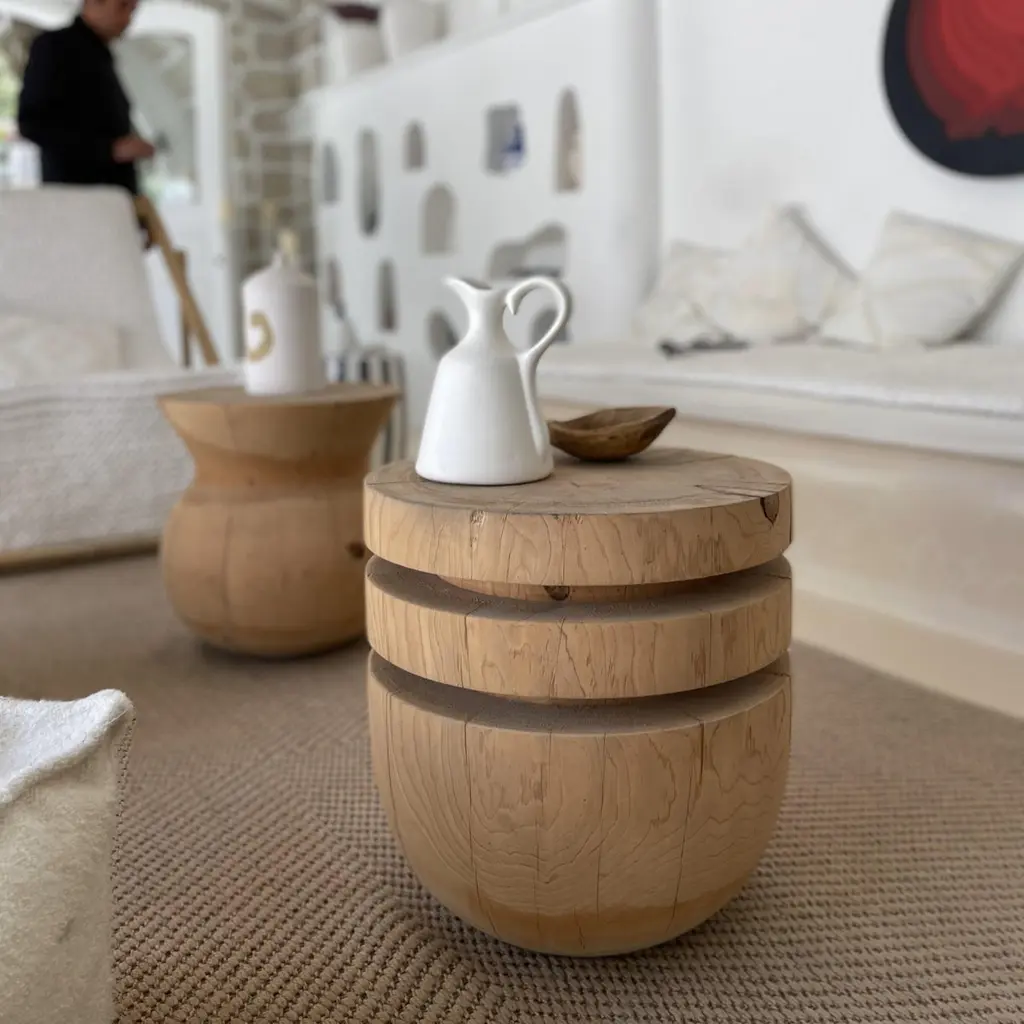 -With its one block of cedar body which is produced with woodturning, it can be used as a bed side, side table, coffee table, or stool in your bedroom and spaces. -The solid cedar wood texture appears more clearly with woodturning method. The cedar wood texture in the product may vary from product to product.-It is produced by hand workmanship.-There are also places to put books.- Diameter: 45 cm Height: 45 cmOur product is made of cedar wood and completely handcrafted. Each type of wood has a unique pattern, texture, shade, and vein pattern. These differences give a unique identity to each Ananas product. Capillary cracks, wormholes, and deformations caused by environmental factors (seasonal deformations) highlight the naturalness of the wood. Due to its structure, wood is not resistant to chemicals, acidic liquids, cleaning products, impact, direct flame contact, friction, or contact with high-temperature materials (cups, pots, etc.). A water-based matte varnish has been applied on the surface of the product. Thus, the longevity of the product has been ensured by eliminating any imperfection, mark, or stain that may be caused by use.We process kiln-dried wood for you (7 to 12 percent). Still, you should keep your product away from water, flame, moisture, and sunlight, the greatest enemies of wood. Thus, you can eliminate any imperfection, mark, or stain that may be caused by use.
