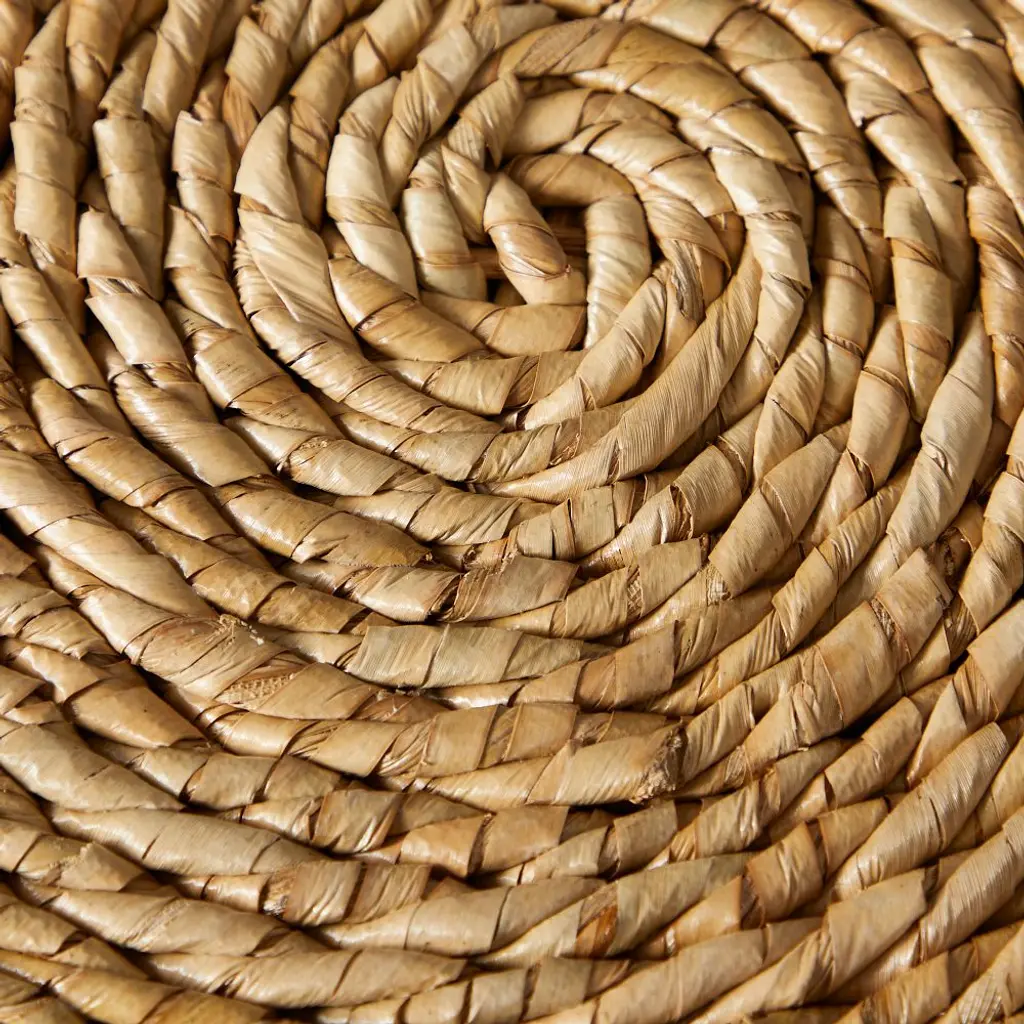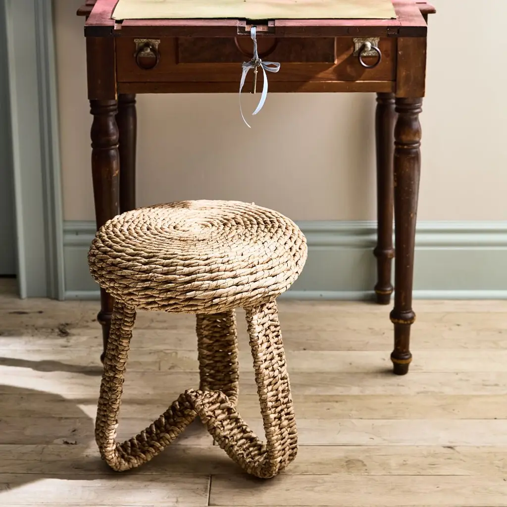 Woven sculpture. Filipino artisans handcrafted this stool from natural seagrass, wrapped around a wrought iron frame. As an extra seat or side table, it’s functional art.