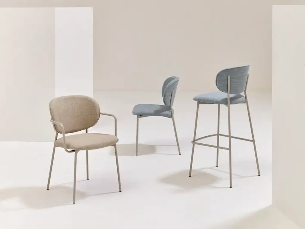 Wround 6C81 is a high stool with a steel frame and upholstered seat and backrest.Wround is a collection characterized by a steel rod frame that supports a seat and backrest with welcoming proportions.This concept is expressed in various versions—from chairs to armchairs, stools to lounge seats—to meet the needs of social spaces that require lightweight, customizable seating coordinated for different areas.