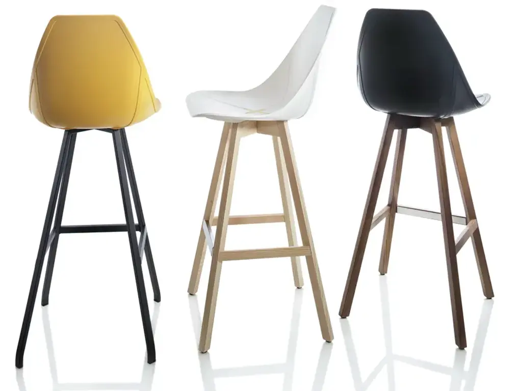 X Wood is a 4-legged stool for contract and homes with stained ash or painted metal frame and conical section. Inox footrest available for ash version. Shell in UV - resistant homo-copolymer, "X" on seat in contrast or in color. Materials and colors: Natural, walnut and black stained ash wood. Polypropylene anthracite, white, sand. Fabrics from sample book. Cross natural ash wood.Available in two heights: mm 650-760.
