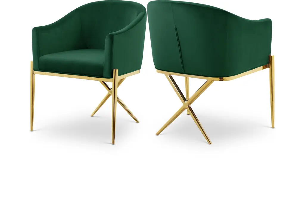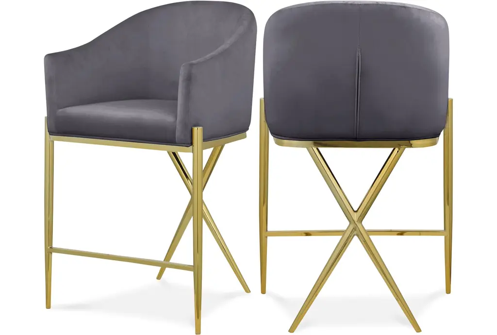 Enhance your dining space with the Xavier Green Velvet Upholstered Counter Height Stool with Gold Finish. This modern stool features a luxurious green velvet seat and a sturdy gold-finished iron frame, adding a touch of sophistication to your home. The tall design ensures that it fits perfectly at any counter height table or bar, providing both comfort and style.