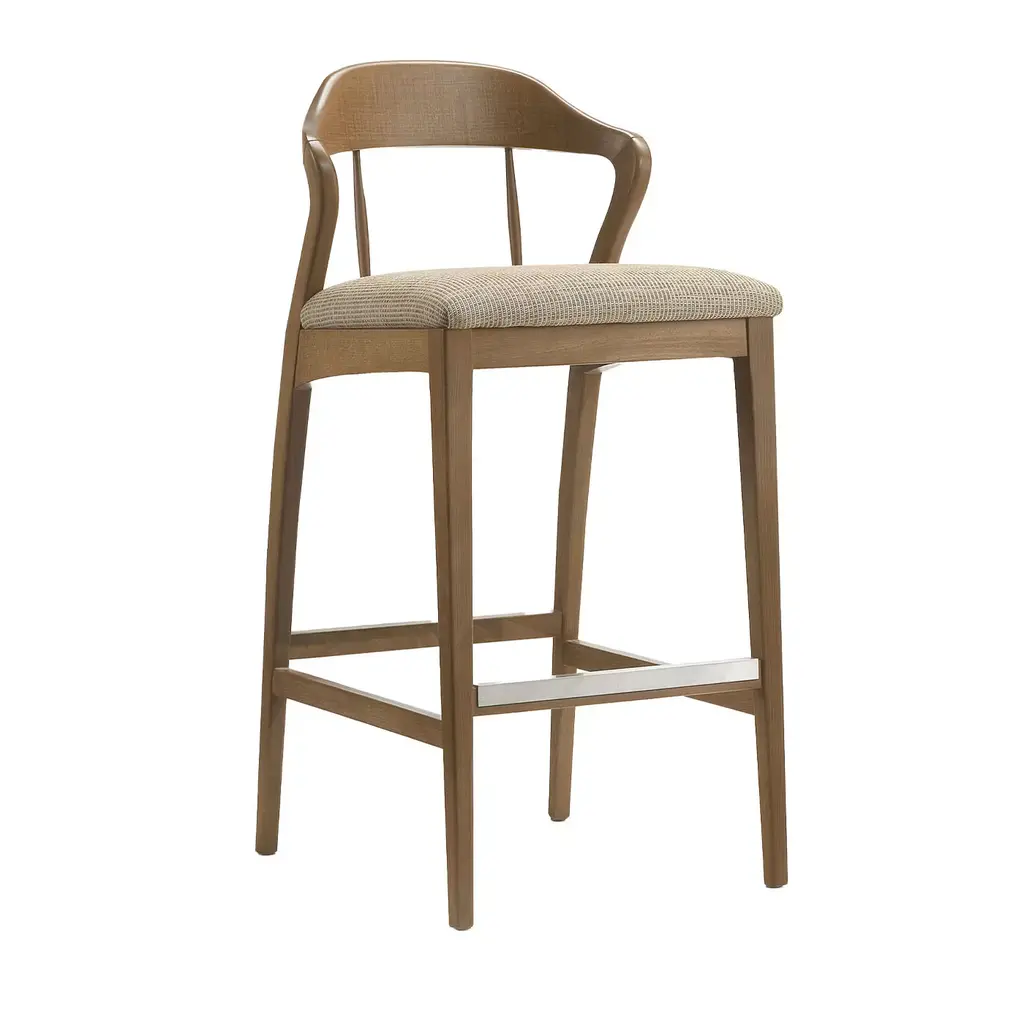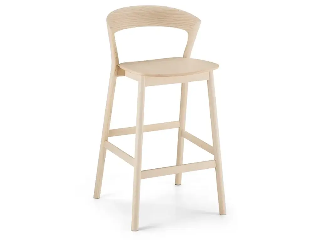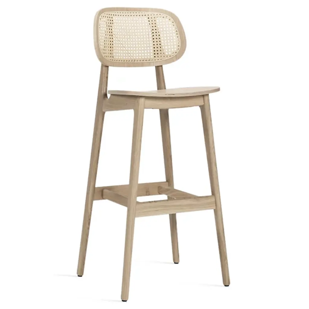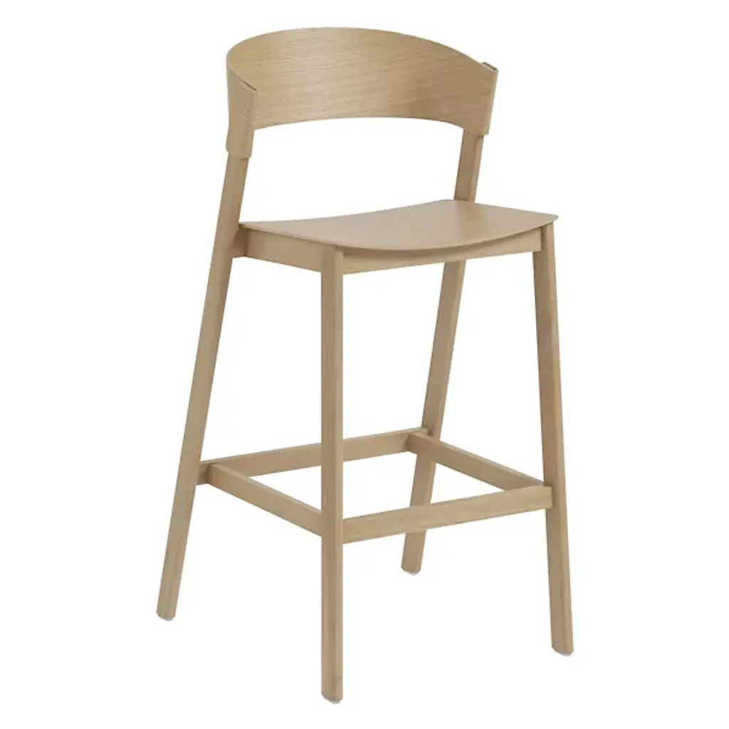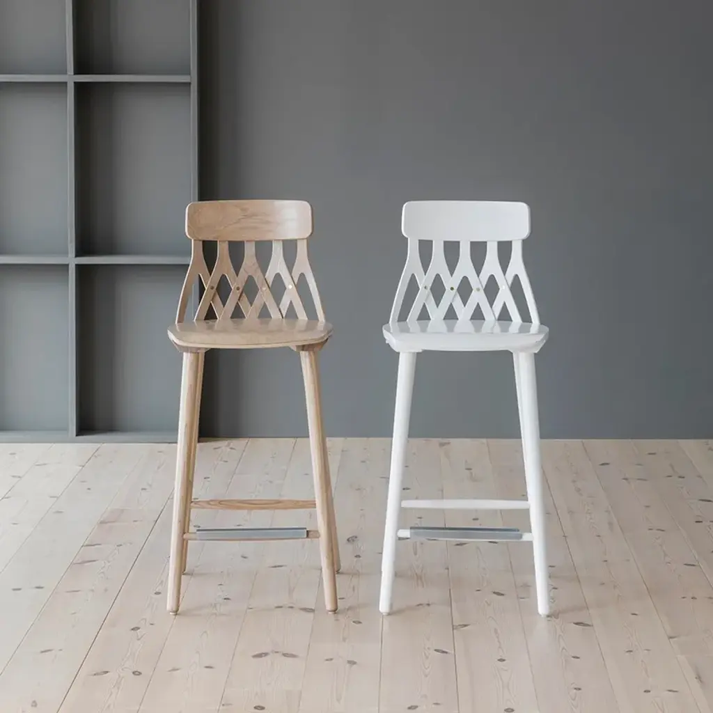 Five rotated molded plywood cut-outs that reminiscent of letter Y are linked together into an organic and strong form of the backrest. These upside-down Y-s define the chair’s identity, but as well provide a great seat comfort together with the other parts of the chair made out of solid wood. Y5 chair with its simple graphic expression can fit any modern or traditional environment. In cooperation with Hans K the Y5 chair has been produced since 2016 and has already won two great awards.Y5 is a high stool in oak, ash or birch, with backrest and footrest. It is available in different heights.