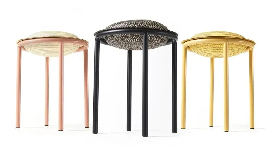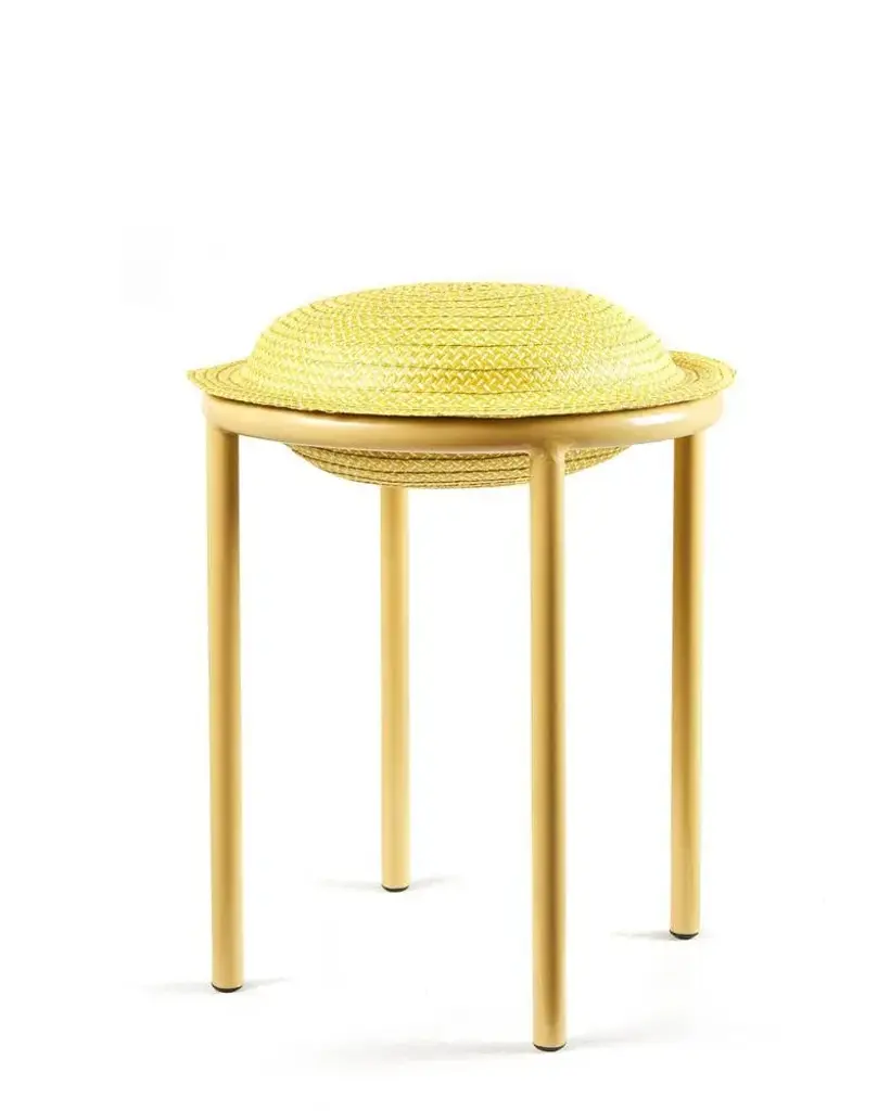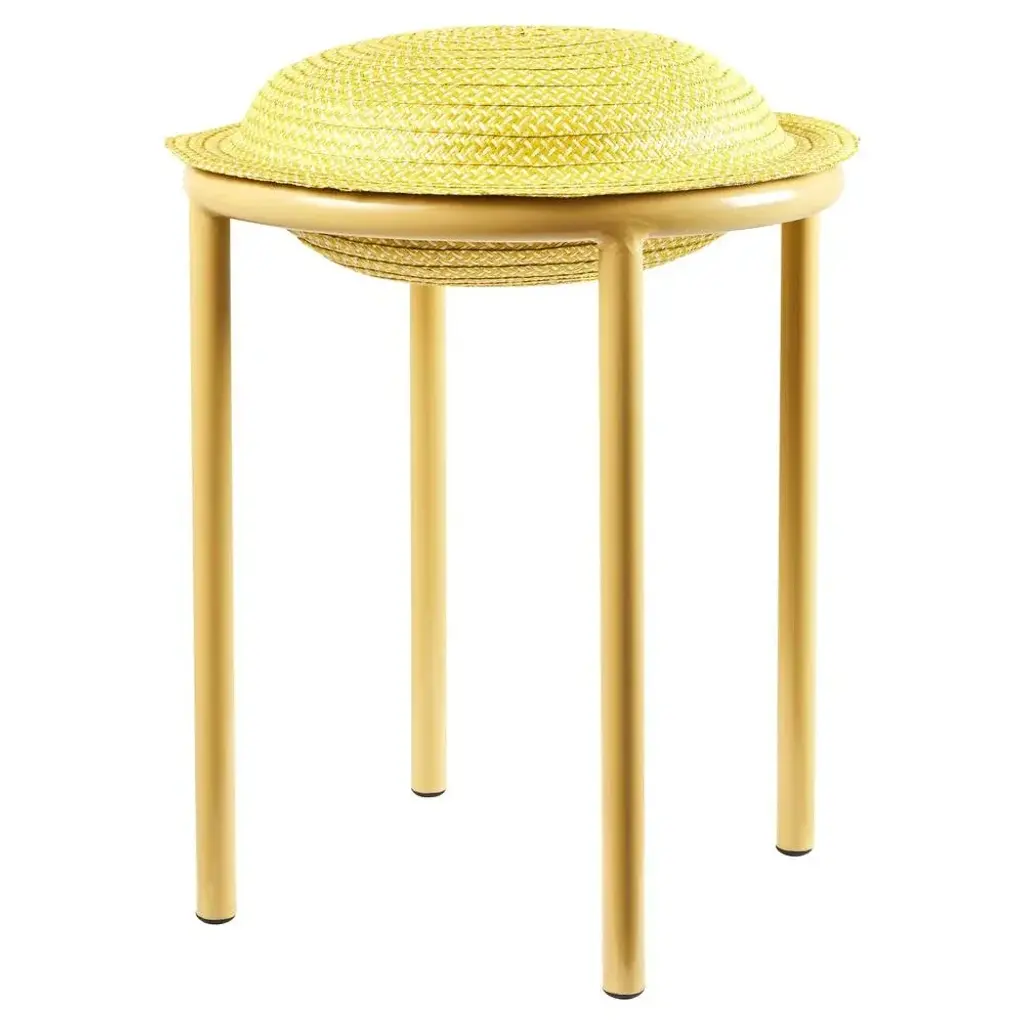 Yellow Cana stool by Pauline Deltour by Cristina Celestino Materials: Galvanized and powder-coated tubular steel. Caña Flecha. Technique: Hand-woven with natural fibers in Colombia. Natural dyed. Dimensions: Diameter 40.2 x height 48.1 cm