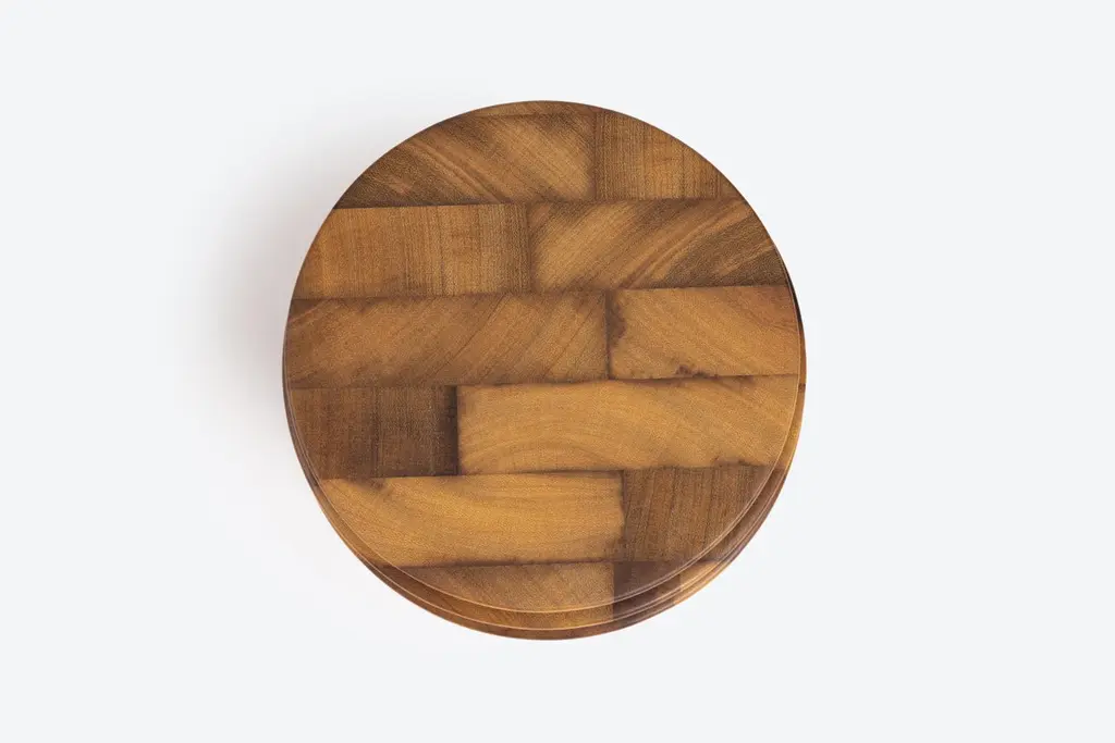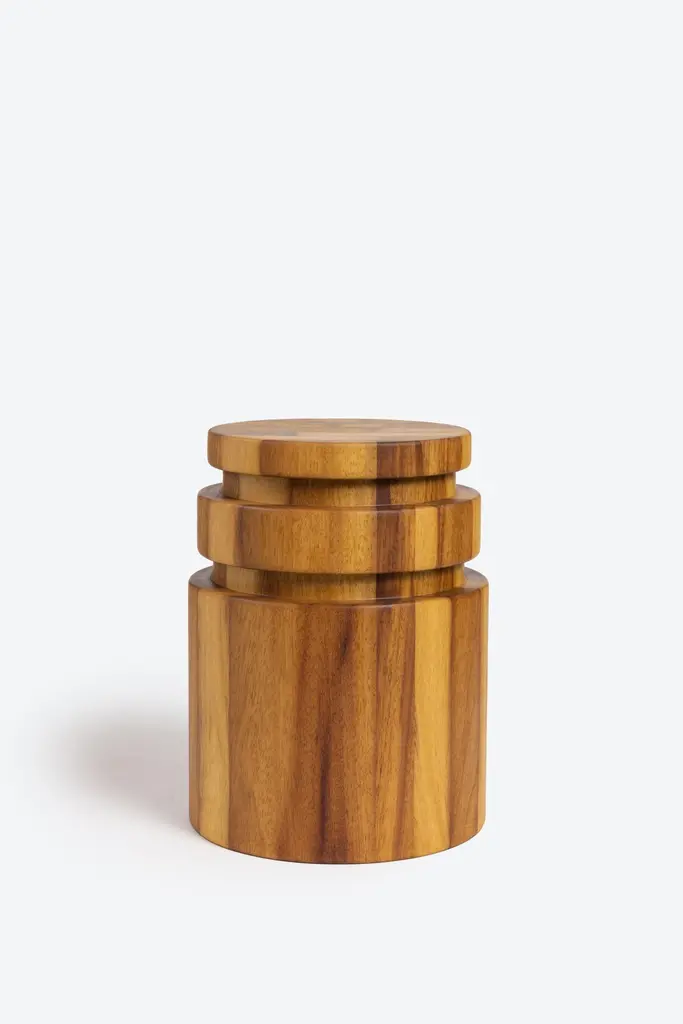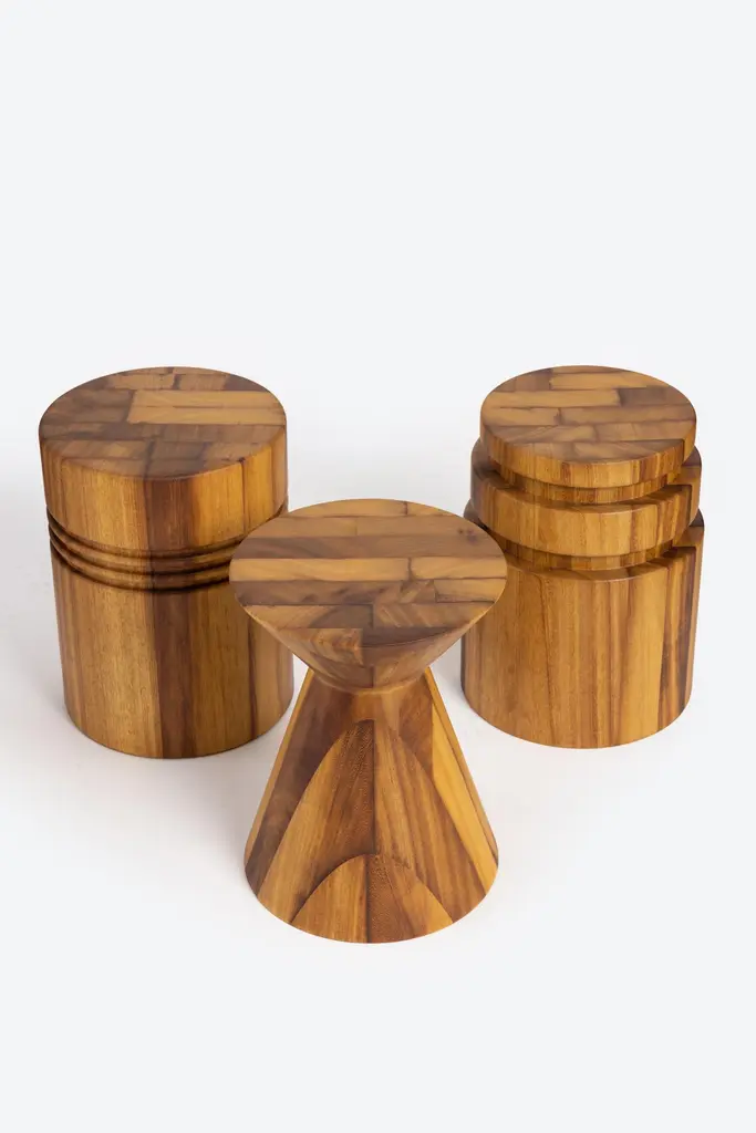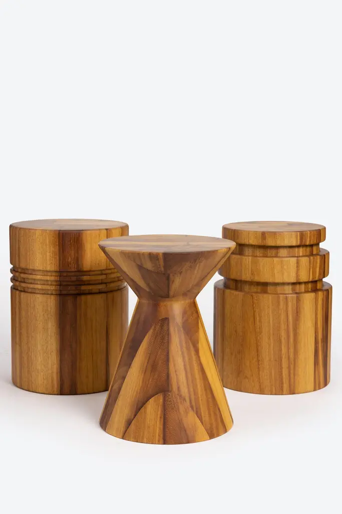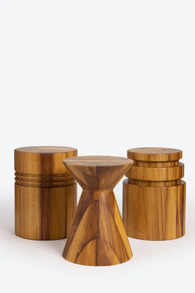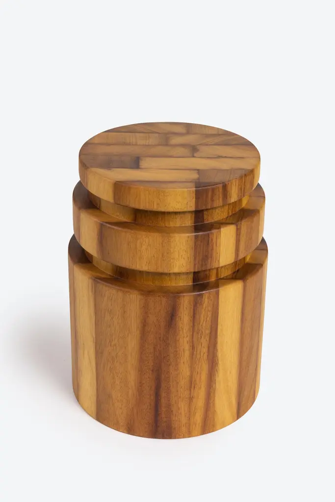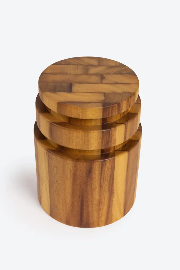 A solid wood stool turned on the lathe with three tiers. It can be used for seating or as a side table. It stands at 16 inches tall x 12 inches in diameter and weighs roughly 30 pounds. Made from Iroko wood. Each stool is unique based on the characteristics of the tree the stool is made from, which determines how the wood is pieced together before turning on the lathe. Made to order. Can be made in different dimensions and wood species.