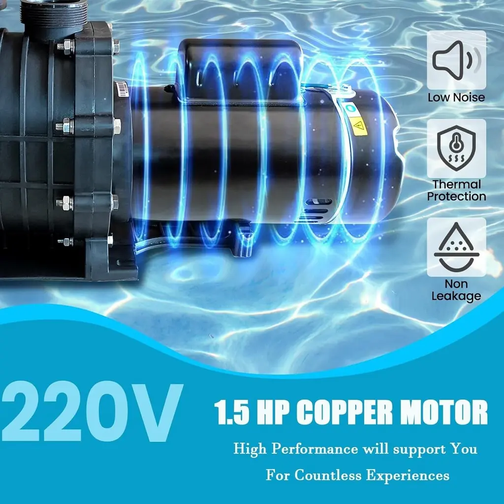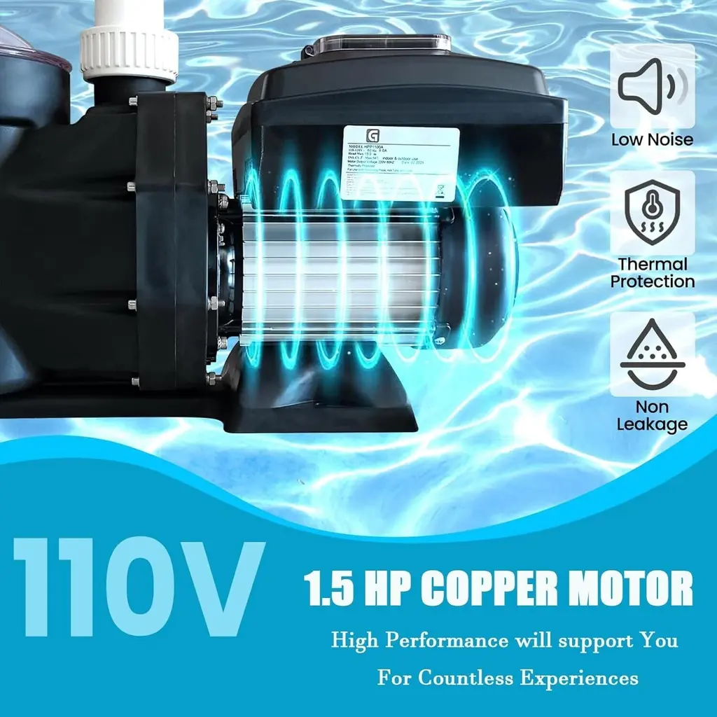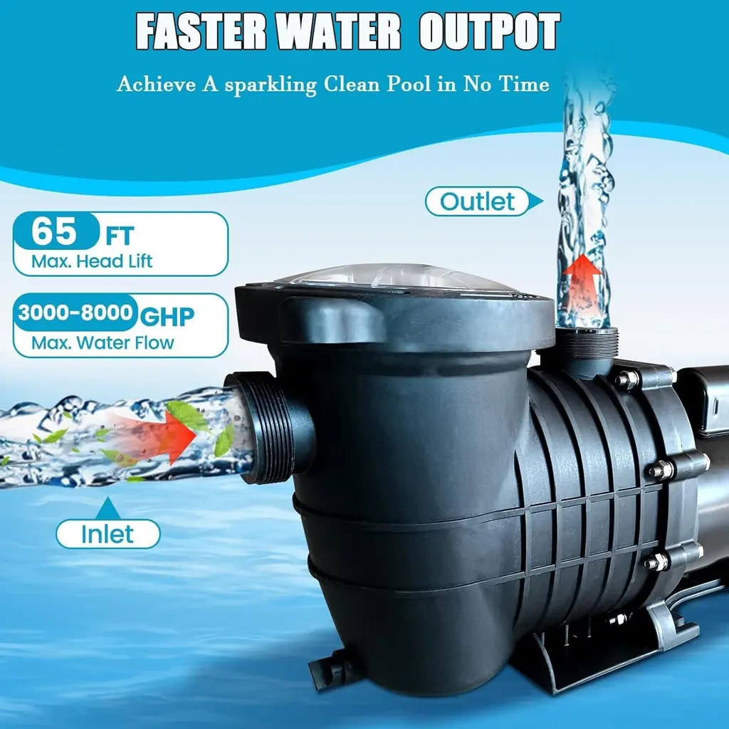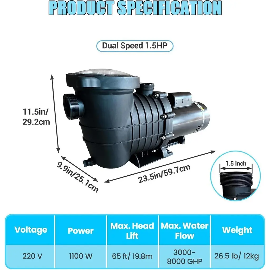 【Powerful 1.5hp Copper Motor】This Self-Priming Swimming Pool Pump Is Equipped With A High-Quality 1.5 Hp Copper Motor, Running At 220v/60hz, And Has Excellent Performance. The Maximum Flow Rate Can Be Adjusted From 3000 Ghp To 8000 Ghp, The Maximum Head Is 65 Feet, And The Built-In Airflow Ventilation Is More Durable, It Will Accompany You For Countless Summers.【Dual Speed Design】Our Pool Pump Has Two Operating Modes-High Speed For Fast Water Circulation And Low Speed For Quieter And More Energy-Efficient Operation. It Is An Excellent Choice Whether You Are Cleaning, Filtering Or Maintaining Your Pool【Excellent Strength And Portability】Made Of Commercial-Grade Reinforced Thermoplastic, It Is Corrosion-Resistant, Strong And Durable. The Oversized Removable Filter Basket Design Makes Cleaning A Breeze, Extends The Life Of The Pump, And Ensures Stable Performance. Its Portability Allows You To Start Using Your Pump Immediately. Start Filtering Anytime, Anywhere.【Suitable For Various Types Of Pools】This Pool Pump Is Suitable For In-Ground/Above-Ground Pools, Perfect For Swimming Pools, Hot Tubs, Spas And Irrigation Systems. Its Specially Designed Impeller Maximizes Flow While Minimizing Noise.【Safety Certification】Our Pool Pumps Are Ul Certified, Ensuring Compliance With Recognized Safety And Performance Standards. Built-In Thermal Protection Can Withstand Water Temperatures Up To 40°C (104°F), Ensuring Durability And Longevity. (Important: Always Fill The Pump With Water Before Use To Prevent Damage To The Mechanical Seal And Impeller.)