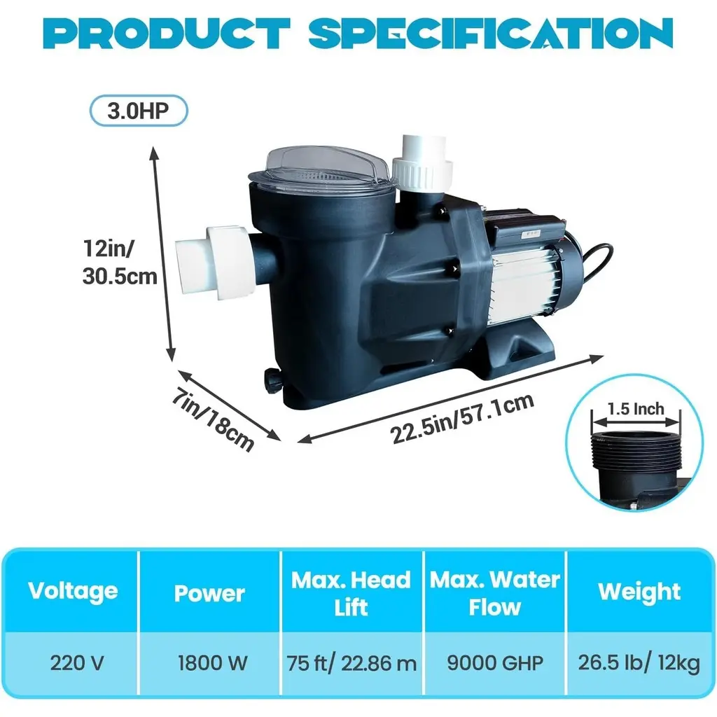 🏊 Powerful 1.5HP Pool Pump: Voltage: 220 V / 60 Hz, Equipped with an IP55 1100W electric copper wire motor, this pump boasts an impressive flow rate of up to 8000 GPH and a maximum head height of 65 feet, ensuring your pool stays crystal clear all season long.🏊 Versatile Design for Any Pool Type: This 1.5 HP self-priming pool pump is perfect for both in-ground and above-ground pools, as well as hot tubs, spas, and irrigation systems. Its innovative impeller design enhances flow efficiency while reducing noise and energy usage, ensuring a hassle-free experience.🏊 Sturdy Construction: Constructed from commercial-grade reinforced thermoplastic, this pump is highly resistant to corrosion, offering exceptional strength and longevity. The oversized, removable filter basket simplifies cleaning and upkeep, ultimately prolonging the life of your pump.🏊 Certified for Safety and Efficiency: Designed with thermal protection, this motor can withstand water temperatures up to 40°C (104°F), promoting durability and extended service life. Our pump is UL certified, ensuring compliance with established safety and performance standards for your reassurance.🏊 Pre-Operation Reminder: Before using the pump, make sure it is fully primed with water to avoid damage to the mechanical seal and impeller. This essential step is crucial for achieving optimal performance and maximizing the pump's longevity.