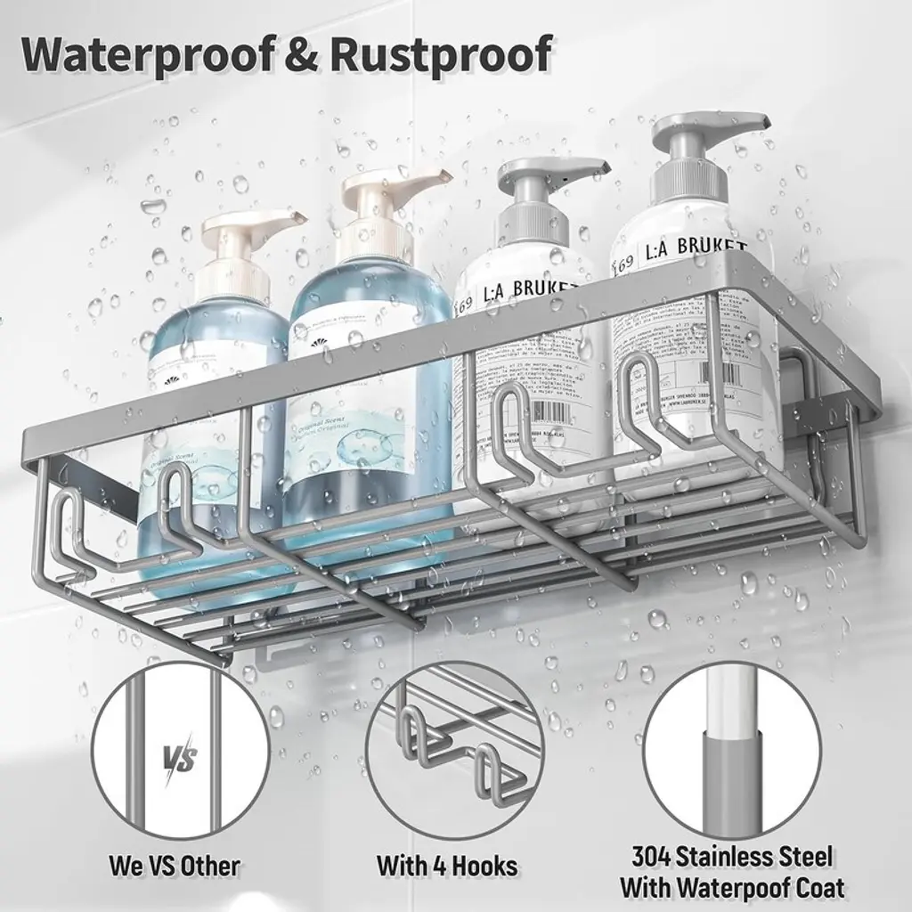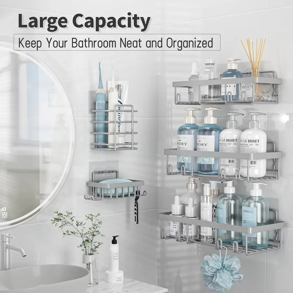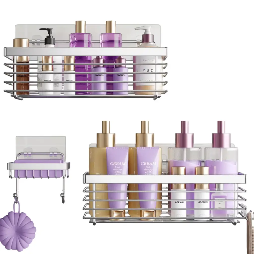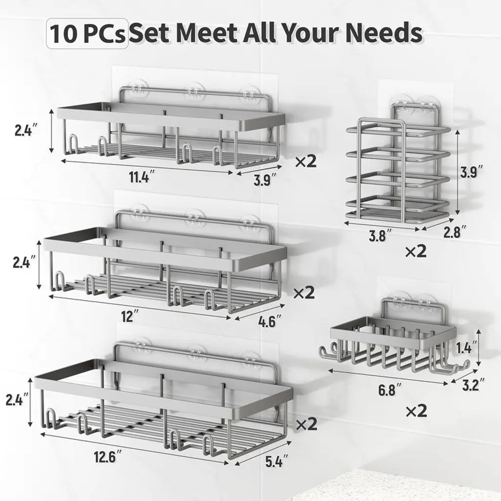 Complete 10-Piece Shower Organizer Set – Includes 6 wall caddies, 2 soap holders, 2 toothbrush holders, and 10 strong adhesives to neatly store all bathroom essentials in one convenient system.No-Tool, Damage-Free Installation – Easy peel-and-stick adhesive mounting requires no drilling – installs securely in just 5 minutes without damaging walls or tiles.Premium Rustproof Stainless Steel – Features waterproof, rust-resistant construction with quick-drying hollow design, ensuring long-lasting performance even in humid bathroom environments.Heavy-Duty Adhesive Strength – Each adhesive strip supports up to 40 lbs, keeping bottles and toiletries securely in place with worry-free stability.Safe & Versatile Storage Solution – Rounded-edge design prevents injuries while organizing shower, bathroom or kitchen items for clutter-free, easy access to daily essentials.