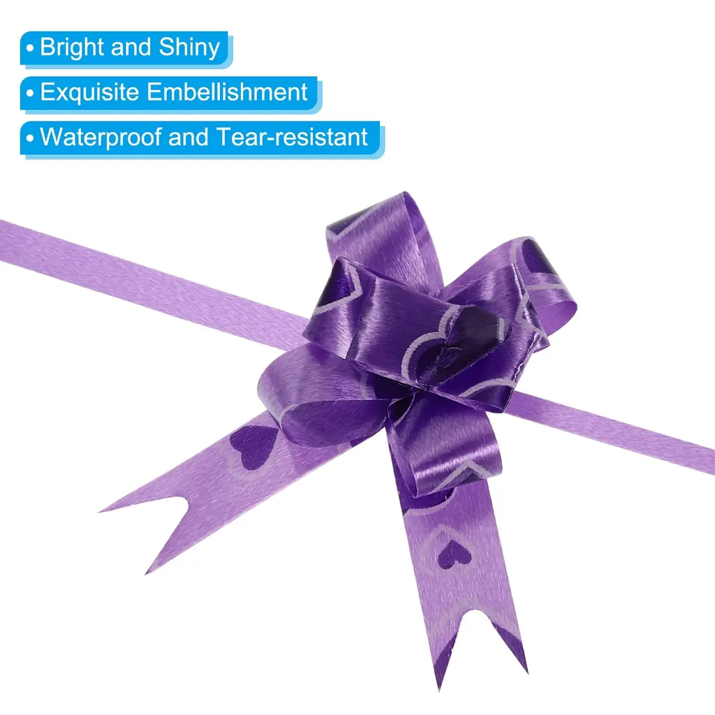These pull bows can be widely used for the decoration of weddings, banquet, Christmas, New Year, Valentine's Day, and other festive celebrations, and can also be used for the decoration of birthday gifts, packaging boxes, bouquet gifts, wine bottles, fruit baskets, cars, etc, to add a festive atmosphere.SpecificationColor: PurpleMaterial: PlasticSize Before Pulling: 20 x 1.1 cm / 7.9 x 0.4 inch (L*W)Packing List: 100pcs x Gift Wrapping Pull BowsAdvantageThe pull bow is made of waterproof plastic, it won't tear easily when pulled, and it's reusable and durable.The bow ribbons have bright colors, and the surface is shiny and lustrous, which plays a very good role in decorating the holiday, making the gift more beautiful and delicate.InstructionPull the two inner ribbon cords, push the outer ribbon up gently, tie a knot, or glue it to the gift box, easy to assemble.NOTE:Just push it up gently along the ribbon, avoiding too much force to damage the fixed knots.Due to manual measurement, there may be slight errors.