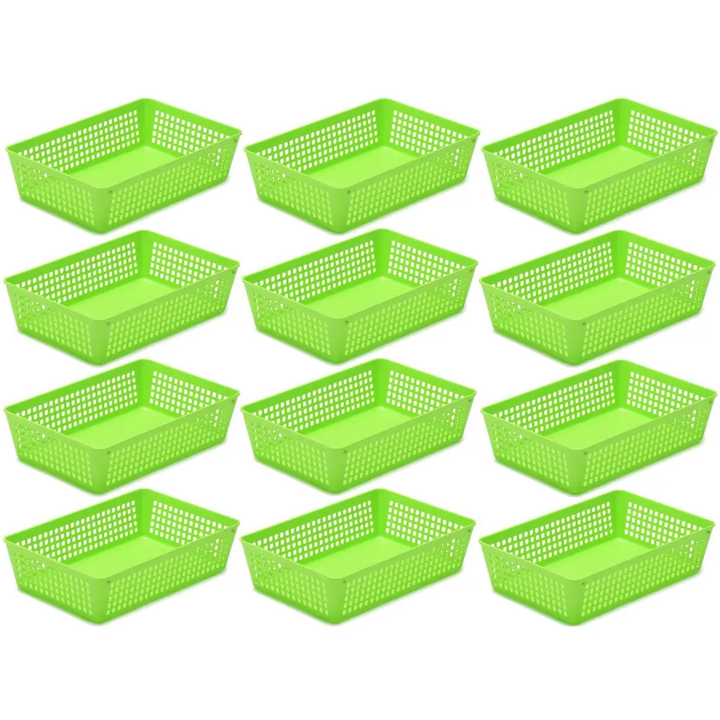 Clean up and organize common areas in your home or office with these plastic storage basketsKeep Supplies ContainedWhether you need to organize the kitchen pantry, bathroom shelves, closet, or kids room, these plastic baskets expedite the process to keep everything organized and easy to access. These baskets are solidly made to contain small items and heavy objects in drawers, desktops, shelves, and pantries without acting flimsy or wobbly. Featuring vented holes for airflow, they are made of BPA-free plastic material and withstands common tear and wear for long-term durability.Attractive Colors to Choose FromStorage baskets built with personality and style in mind. We offer these trays in six vivid colors to match your living settings:- Blue- Green- Gray- Pink- Purple- White