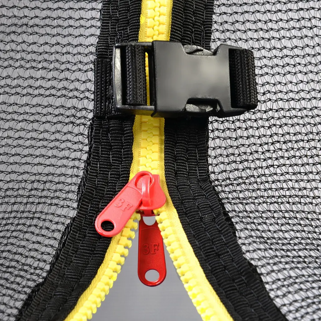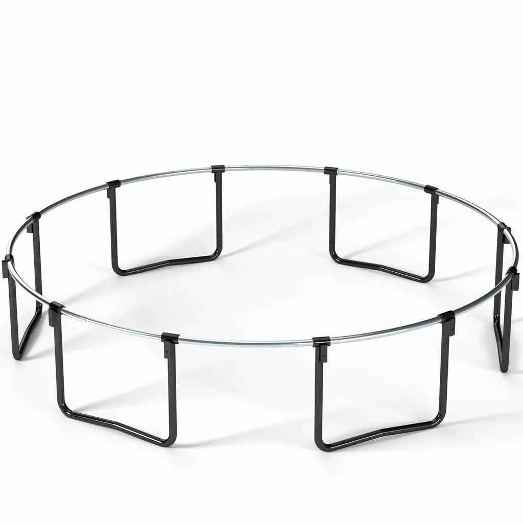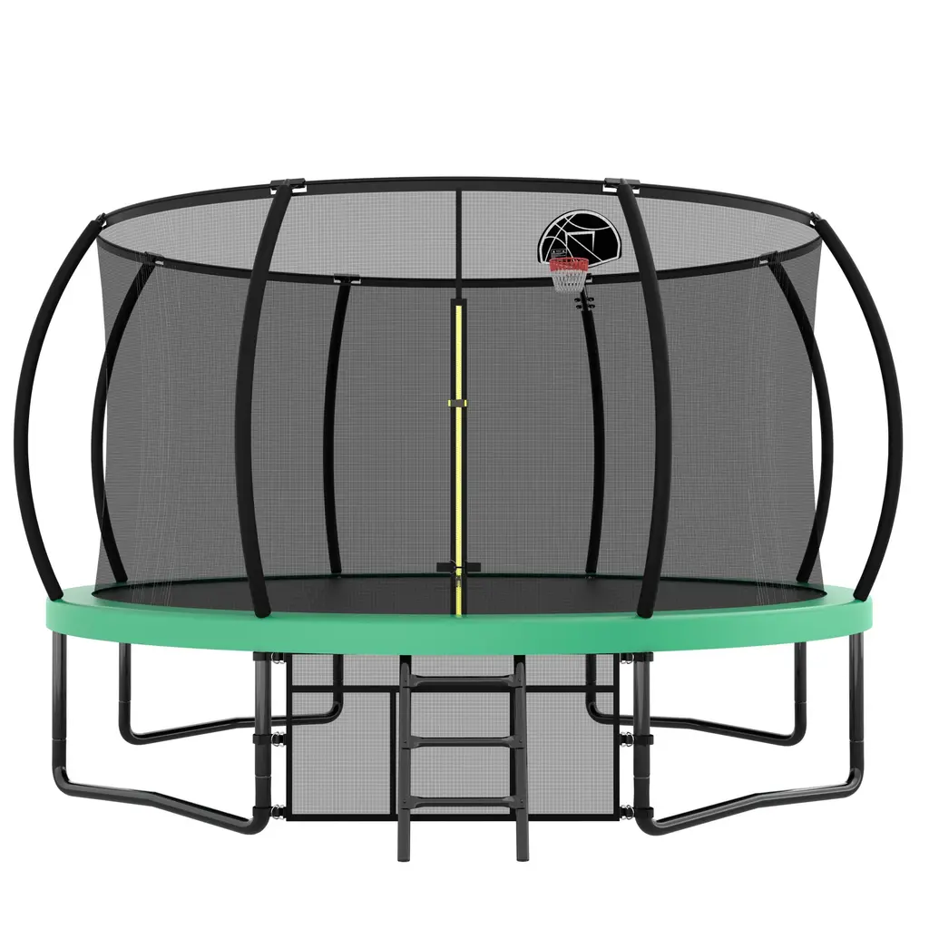 High-Dip Galvanized Frame: Our outdoor trampolines have galvanized steel frames, ensuring durability, weather resistance, and rust prevention. W-Shaped Legs: The trampoline features W-shaped legs, making it more stable and safer. The galvanized legs with extra powder coating ensure a longer-lasting outdoor performance and stronger rust resistance. Curved Net Poles: Equipped with curved net poles with thick foam tubes, our trampoline provides MORE SPACE between kids and the poles for wild bouncing fun and enhanced safety. Reinforced Jumping Mat: The reinforced jumping mat is made from PP material and has passed the American UV standard 5000-hour test, ensuring long-lasting durability in the sun. Durable Spring Cover: The top layer of the spring cover is made of thick PVC tarpaulin material, which is waterproof, weather-resistant, and UV-resistant for extra protection. Comprehensive Fun: Our trampolines come equipped with a basketball board, hoop, ball, inflator, and ladder, providing overall fun for children while helping to connect parents with their kids.