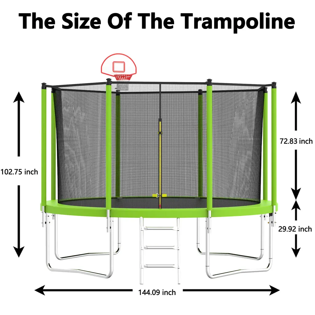 12ft Trampoline Green For Kids & Adults With Basketball Hoop And Ball ,Recreational Trampolines With Safety Enclosure - Green