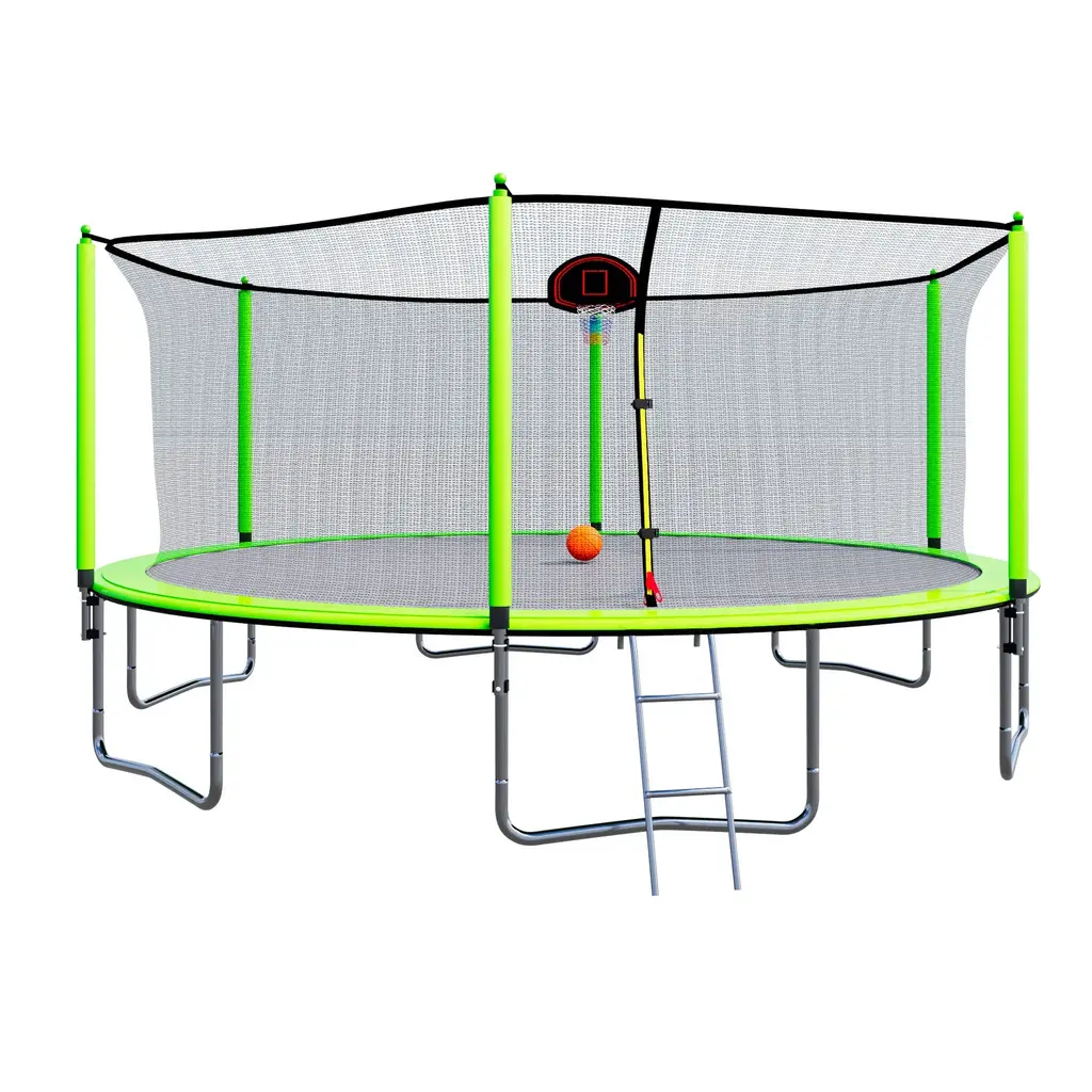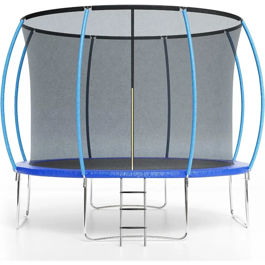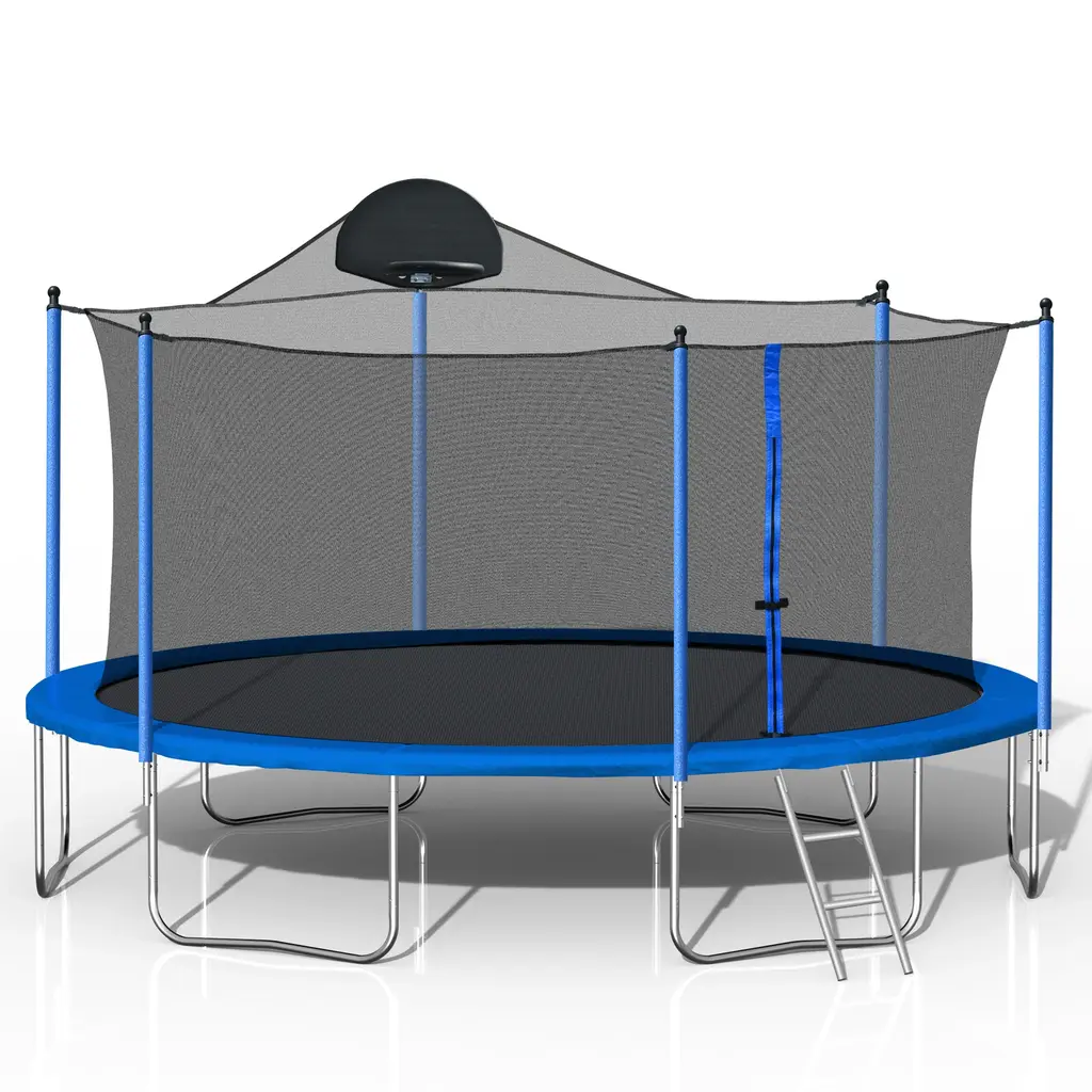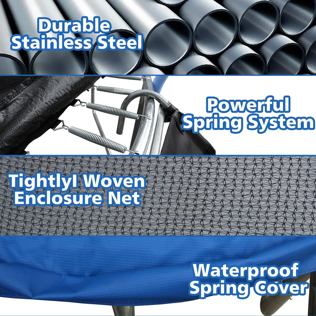 Warm tips: Product after-sales guide 🚀Thank you for purchasing our products!Please do not return the product in case of problems. Please take a photo and send it to us, we will quickly process and provide a reasonable solution. Thank you for your cooperation! 🙏【CURVED POLES DESIGN】 For safety we innovated our trampolines with next gen curved poles. With the curved pole, there is more space between the child and the pole to have fun bouncing. The waterproof spring cover tightly includes high elasticity springs for added trampoline cushioning space to ensure safety!【KIDS-FRIENDLY】 The trampoline's foam sleeve ensures that your child won't get hurt if they hit the frame. The ladder is made of patterned plastic, which is safer than the steel frame material and is less likely to slip when your child climbs. Our trampoline is equipped with a seamless fully enclosed safety net, which is an excellent choice for your exclusive amusement park in your backyard.【STABLE STRUCTURE】 The mainframe of the trampoline is supported by high-quality galvanized steel, which can fully hold the unlimited vitality of children. With thickened rust-proof steel material, the trampoline will not fade when used outdoors. 4 sturdy U-shaped legs with 8 balanced contact points add stability to the trampoline.【INTIMATE】 This trampoline consists of 72 sturdy and flexible springs, combined with a high-elastic, tough jumping mat, which can ensure the stability of each bounce. We use a redundant spring configuration to ensure a soft impact and avoid excessive tension on the feet and joints.【MULTIPLE FUN】 Comes with an 18-inch mini basket board and slide accessory to make the trampoline more than just a bouncing tool, adding more activity for children.