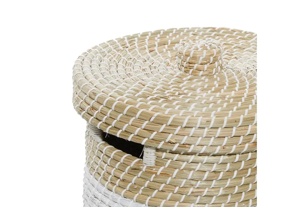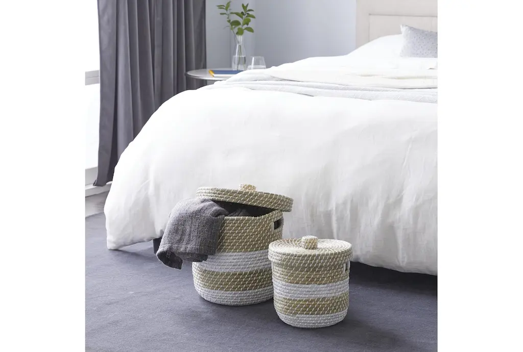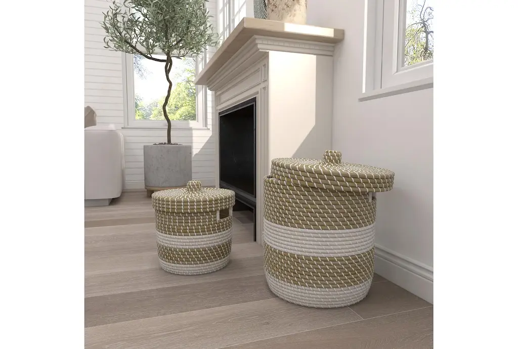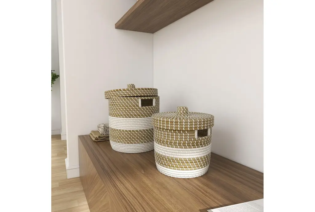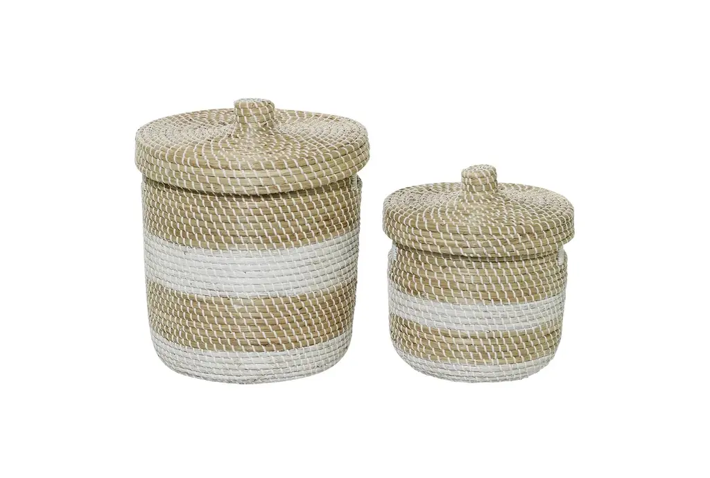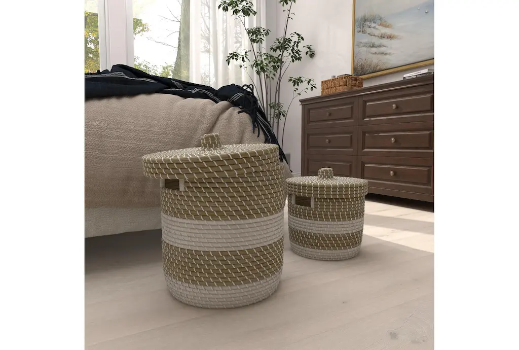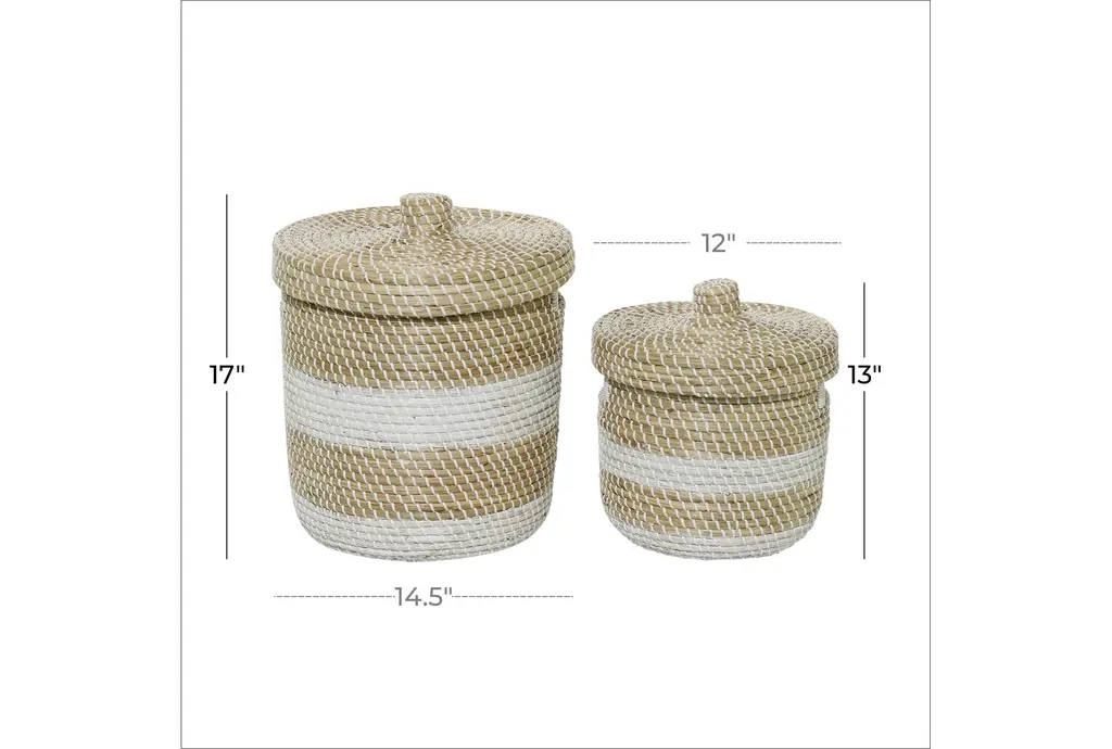 13 + 17 Inch Natural Brown Seagrass Handmade Multi-Media Two Toned Storage Basket With Matching Lids Set Of 2 With Storage