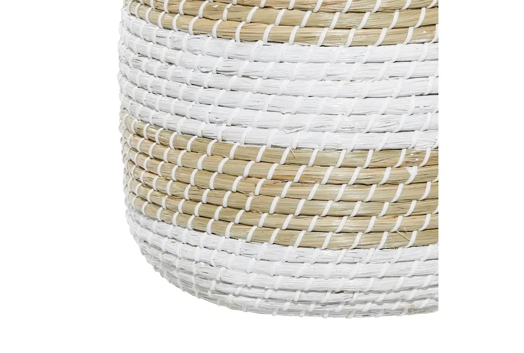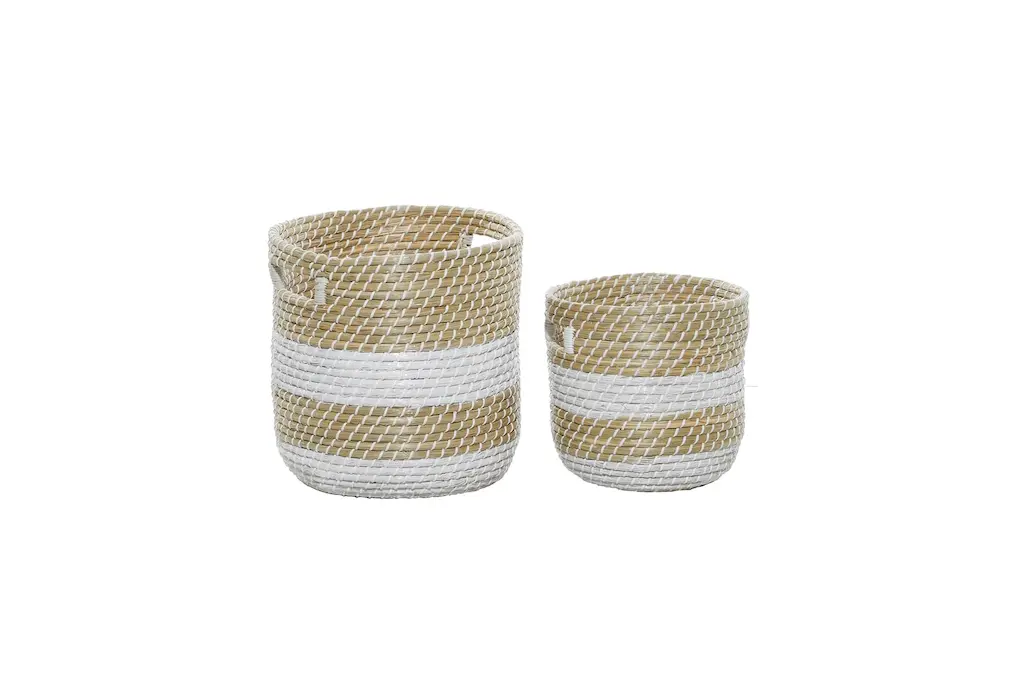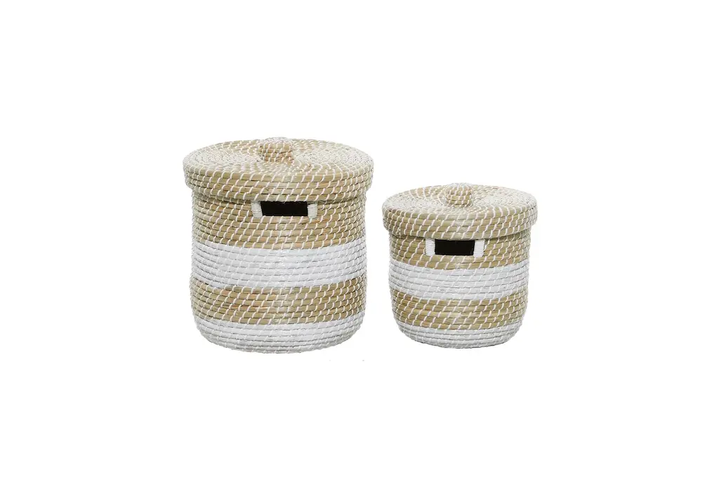 These seagrass baskets are both decorative and useful—can be used as accent decor pieces or storage baskets.. This item ships in 1 carton. Due to the handmade nature of these, there will be slight color, shape, and size variations, as well as loose fibers. Suitable for indoor use only. This item ships fully assembled in one piece. Maximum weight limit is 5 lbs. Made in Vietnam. This brown colored basket organizer comes as a set of 2. Coastal style.