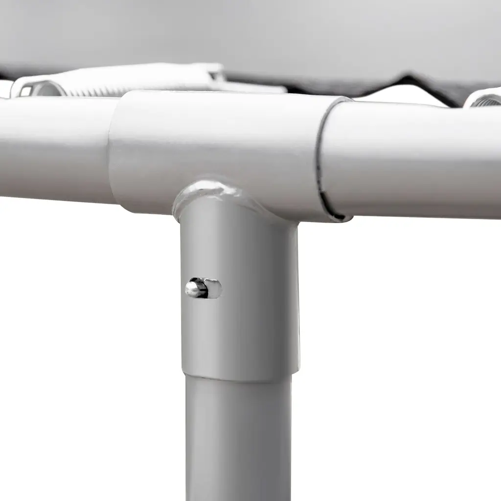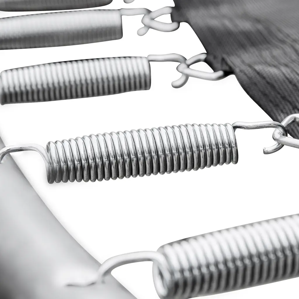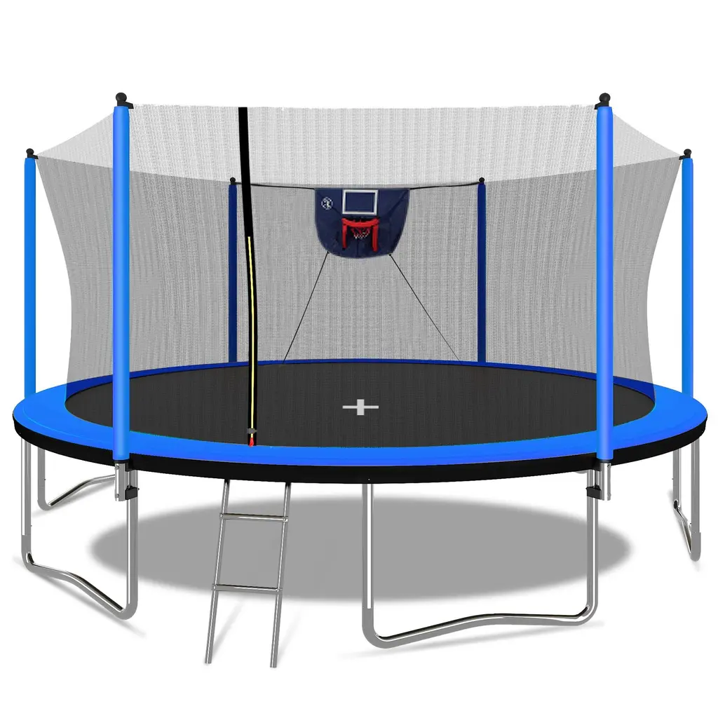 High-Dip Galvanized Frame – Our outdoor trampolines have galvanized steel frames, ensuring durability, weather resistance, and rust prevention.Multiple Safety Certificates Approved - exceeds all US/EU safety ratings and is officially ASTM safety certified F318-16 & F2225-15, CPC, ISO 14001 & 9001, Intertek, and BSCI approved.Enclosure Net Protection System - Our backyard trampoline features a high density, UV resistant safety enclosure net keeps children safe inside the enclosure. The foam padded safety enclosure poles come with extra PE sleeves provide an additional layer of protection and keep the foams from rust and corrosion.Our toddler trampoline jumping mat has passed 5,000 hours UV test, thicker V-Rings and bounce safely with extra rows of safety.Equiped with a basketball board,a basketball and pump.