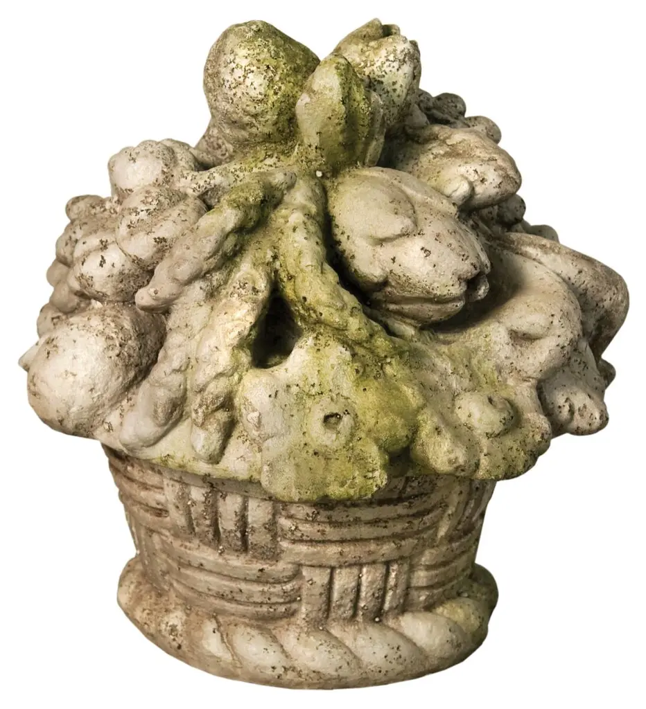 With an artful weathered finish, including a mossy tinge, this fruit-filled piece is a charming touch to the patio or garden.