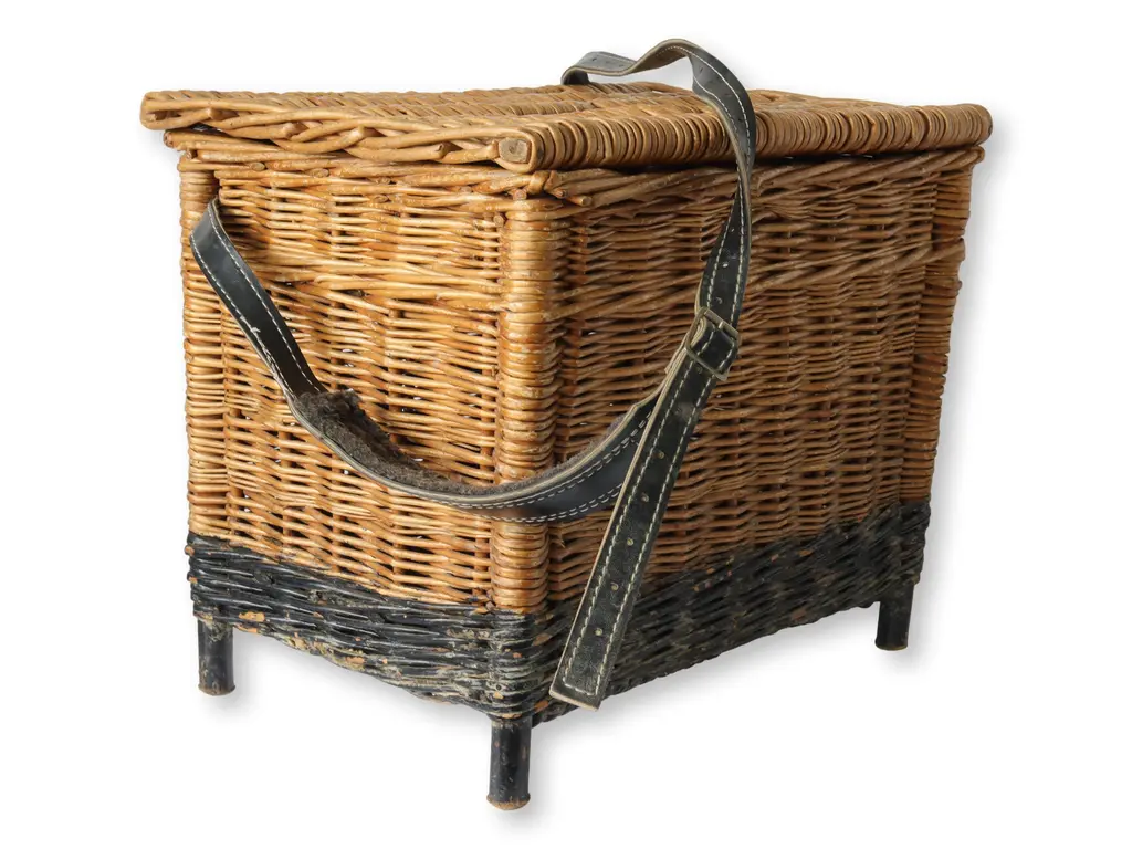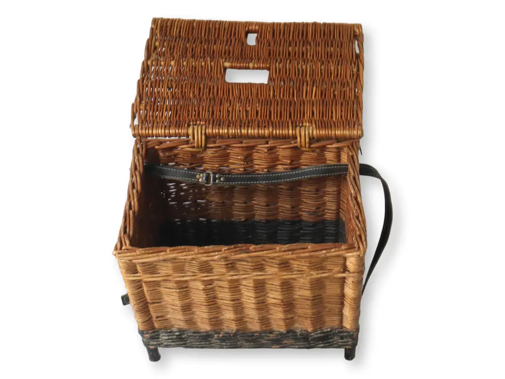 This early 1900s English wicker fishing basket exemplifies craftsmanship and rustic charm. With its sturdy build and rich patina, it captures the essence of outdoor adventure and would serve as an excellent decorative piece or a functional item for angling enthusiasts.
