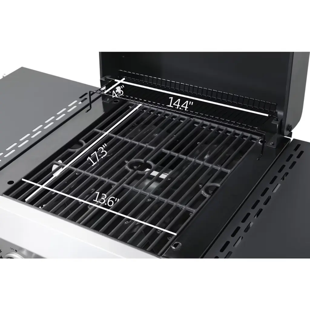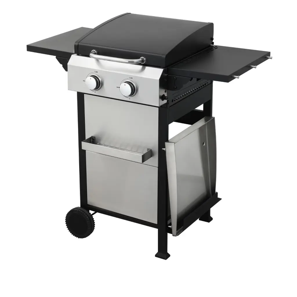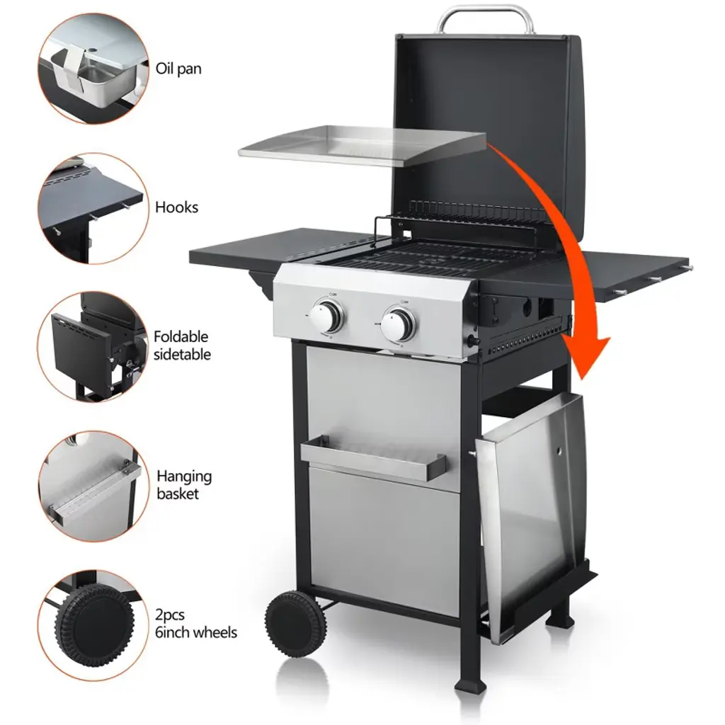 This compact 2-burner propane grill features a stainless steel plancha paired with wire enamel cooking grids for versatile outdoor cooking. Foldable side tables, hanging baskets, and a pull-out oil pan provide convenient workspace and easy cleanup. Push-and-turn ignition with independent burners ensures precise heat control, making this grill ideal for backyard gatherings, patios, or small outdoor entertaining spaces.
