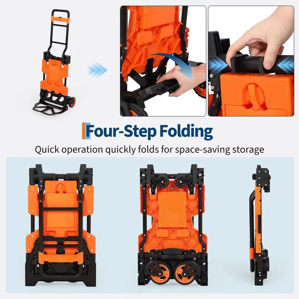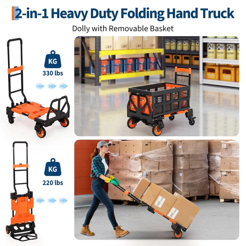 Product DescriptionThis 2-in-1 folding hand truck easily transforms between a 2-wheel upright dolly and a 4-wheel cart—no tools required. Compact and portable, it folds down to fit in most car trunks, making it ideal for travel or daily errands. With a durable collapsible basket, securing strap, and adjustable telescoping handle, it offers comfort and convenience on the go. Built with a strong metal frame, it supports up to 330 lbs and glides smoothly on four quiet wheels. Perfect for shopping, deliveries, office use, or moving heavy loads with ease.Product InformationColor: Orange/GreenMaterial: Iron, Polypropylene (PP)Caster Type: SwivelFrame Material: IronHandle Material: Alloy SteelItem Weight: 21.94 PoundsWeight Limit: 330 PoundsProduct Dimensions: 28.15 x 15.75 x 8.07 inchesNumber of Wheels: 4Special Feature: 2-in-1 ConvertibleAssembly Required: NoRecommended Uses For Product: Indoor, Outdoor