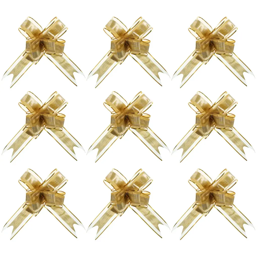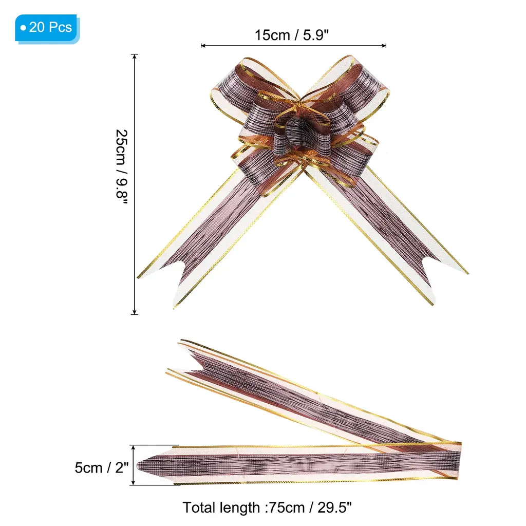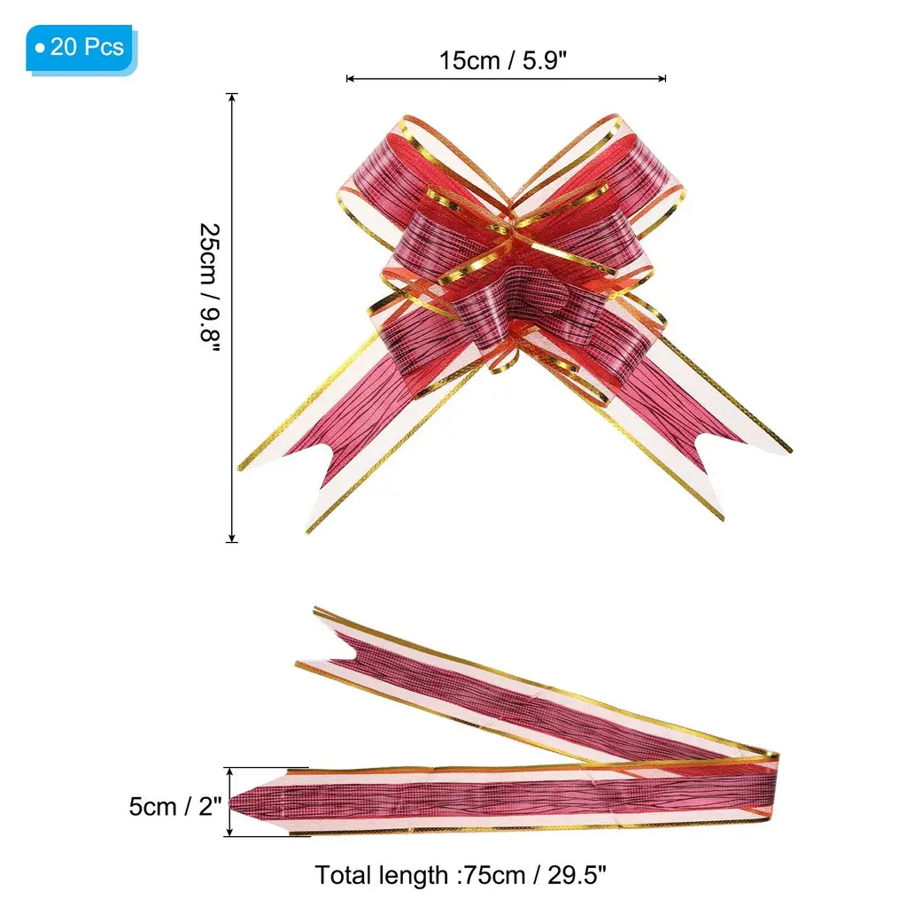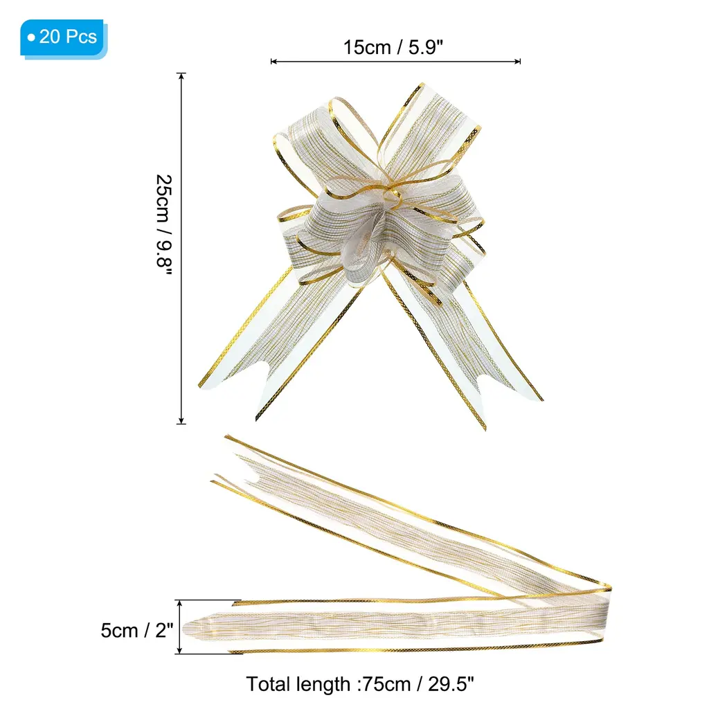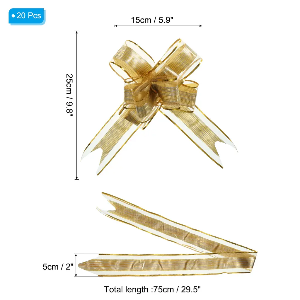 These large flower pull bows can be widely used for Christmas, wedding halls, wedding cars, banquet, New Year, Valentine's Day, and other holiday celebrations. Can be used to decorate birthday gifts, packaging boxes, gift boxes, bouquets, wine bottles, fruit baskets, indoor rooms, stairs, door handles, etc. to add a festive atmosphere.SpecificationColor: Gold ToneMaterial: PlasticFlower Bow Size: 15 x 25 cm / 5.9 x 9.8 inch (Dia*L)Size Before Pulling: 75 x 5 cm / 29.5 x 2 inch (L*W)Packing List: 20pcs x Large Gift Wrapping Pull BowsAdvantage1. The pull bow is made of plastic, it won't tear easily when pulled, and it's reusable and durable.2. The bow ribbon is brightly colored and the translucent snow gauze texture makes the ribbon more exquisite. It can enhance the atmosphere during the festival and make the gift more beautiful.Instruction1. Find the two inner ribbon ropes from the bottom and grab them.2. Gently push the outer ribbon up to form a flower shape.3. Bundle or glue it to a gift box.NOTE:1. Just push it up gently along the ribbon, avoiding too much force to damage the fixed knots.2. The ribbon has a slight plastic smell. After receiving the goods, place the ribbon in a ventilated place for a period of time and the smell will disappear.