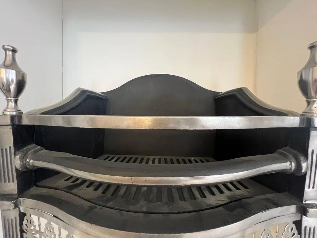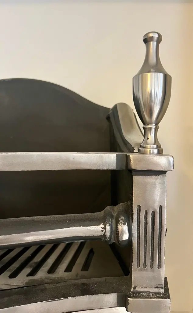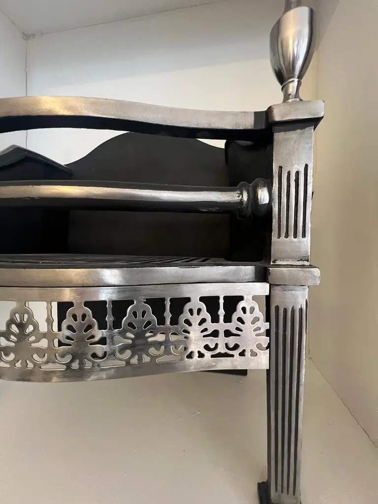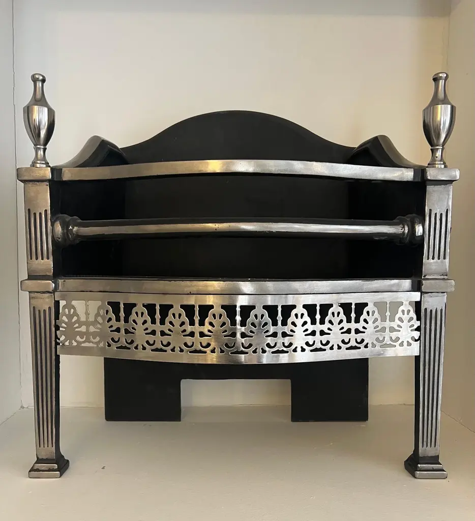 21st Century Polished Cast Iron Fireplace Basket.A Georgian Style Medium Sized, Tapered Burnished Cast-Iron Fire Grate With & Polished Steel Frett & Finials.Dimensions:Front Width 21. 1/2"Back Width 18"Depth 12"Front Height 15. 3/4" (to top of bars)Front Height 20" (to top of finials)Back Height 22"