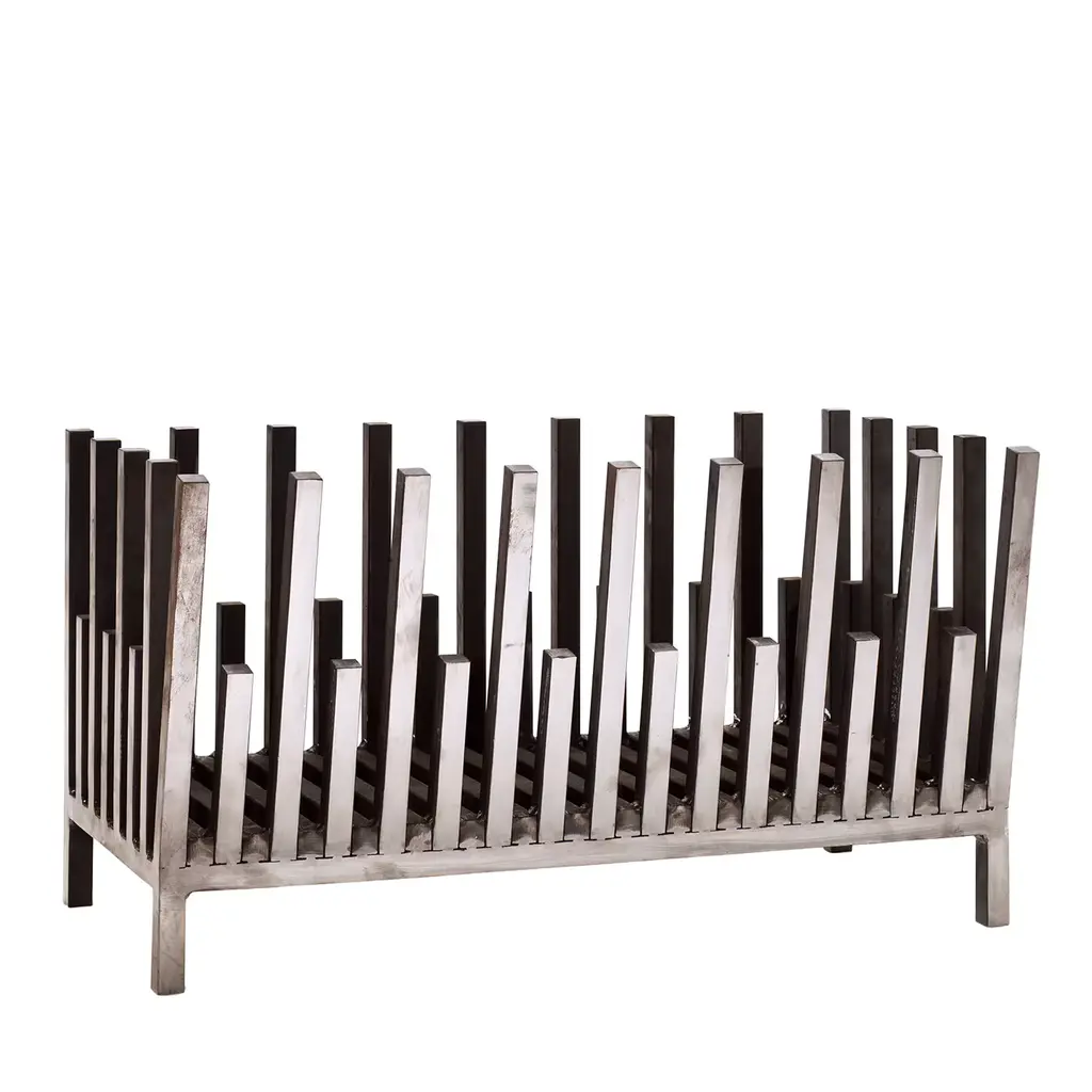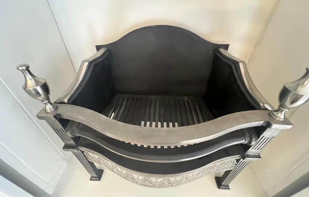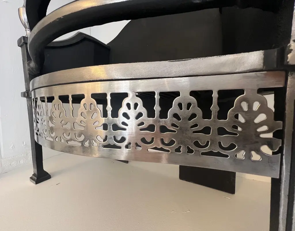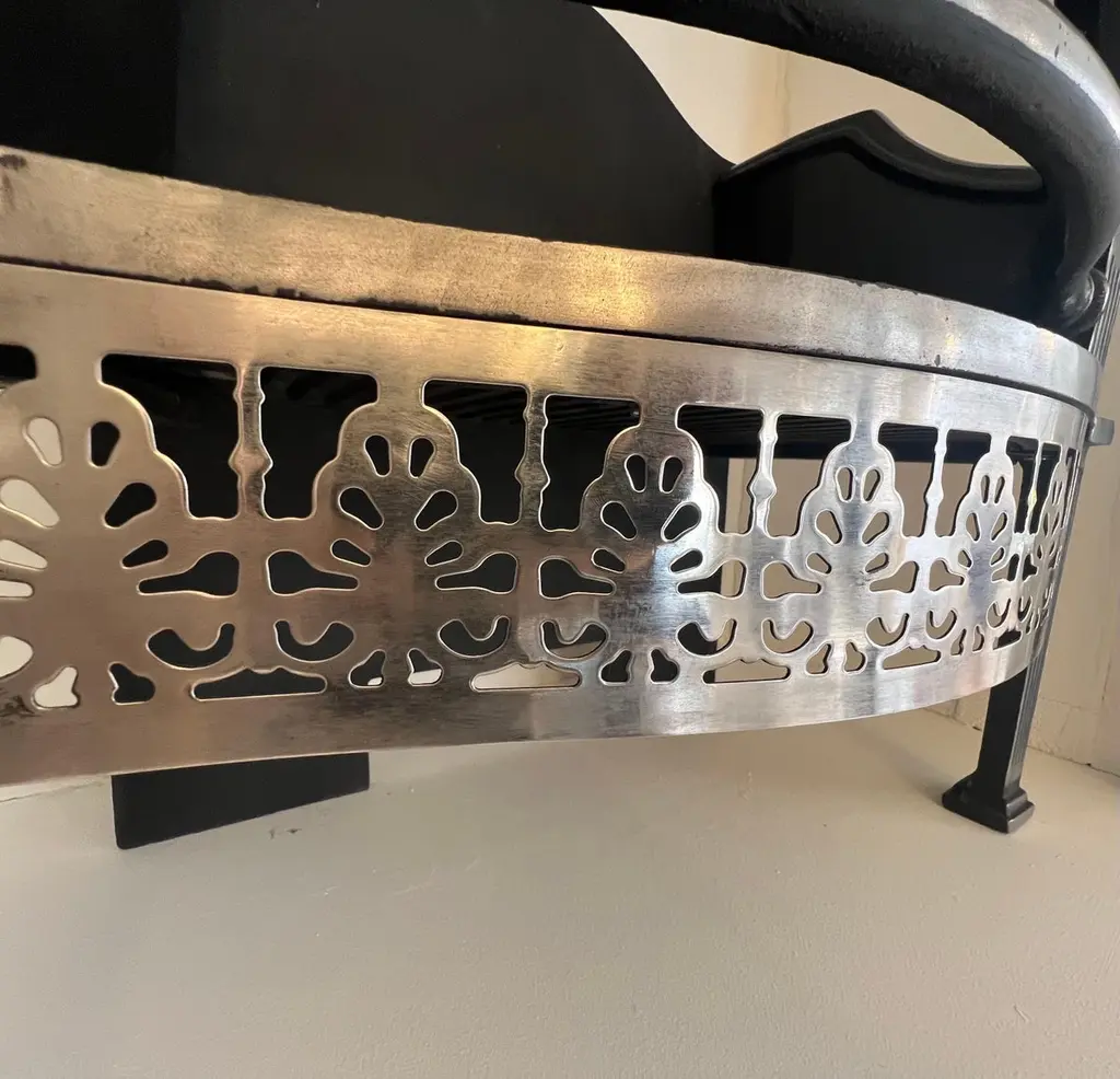 21st Century Polished Cast Iron Fireplace Basket.A Georgian Style Medium Sized, Tapered Burnished Cast-Iron Fire Grate With & Polished Steel Frett & Finials.Dimensions:Front Width 21. 1/2"Back Width 18"Depth 12"Front Height 15. 3/4" (to top of bars)Front Height 20" (to top of finials)Back Height 22"