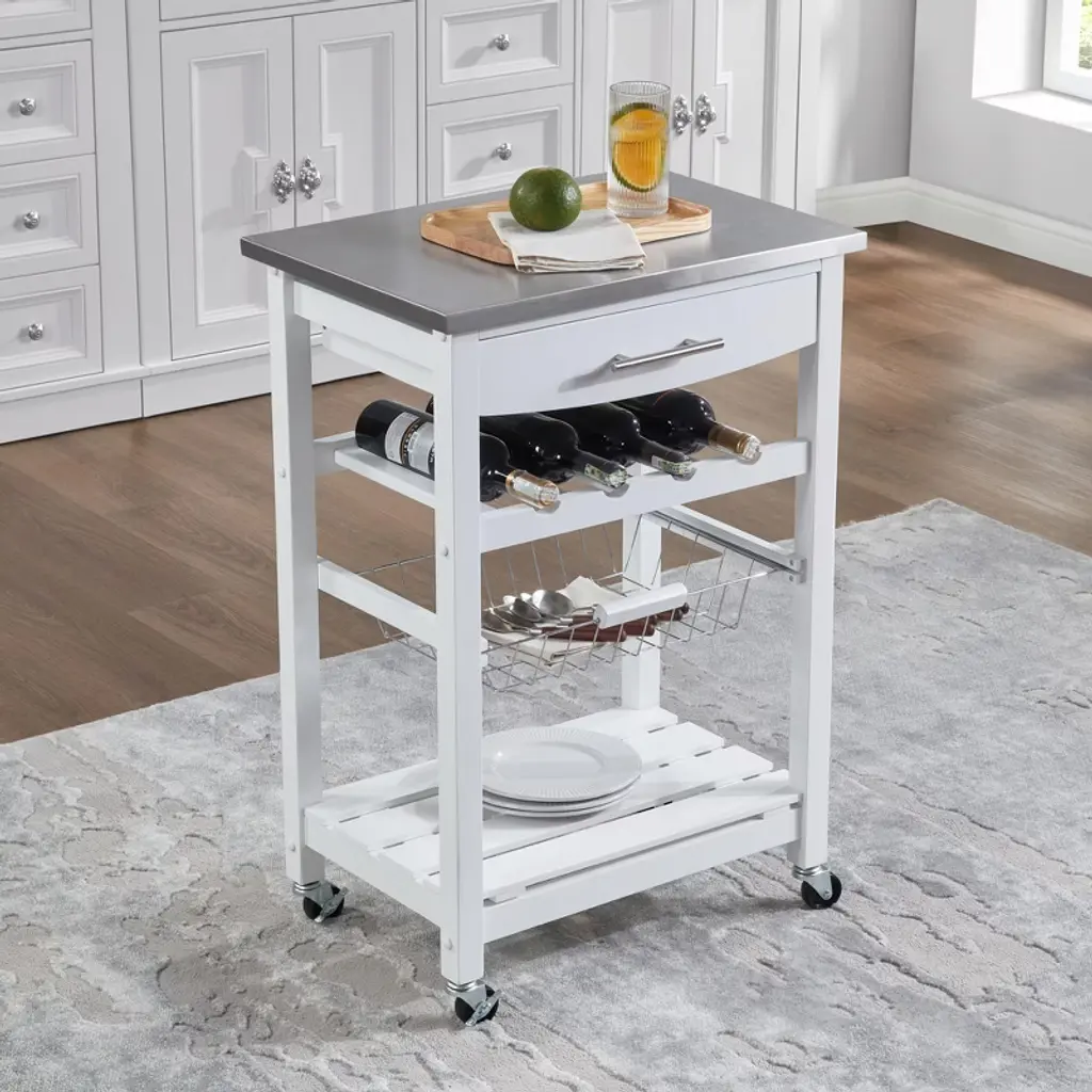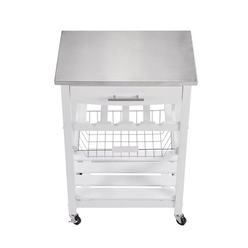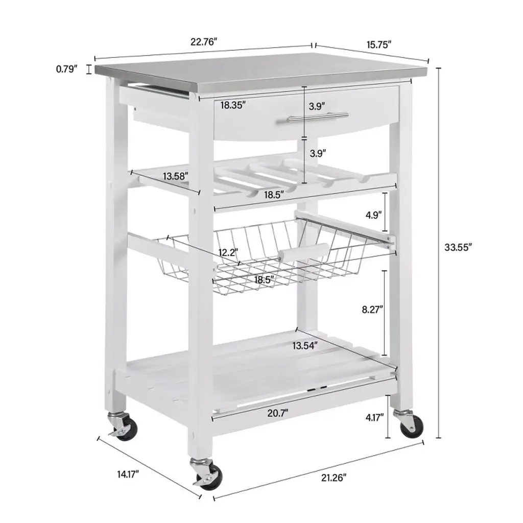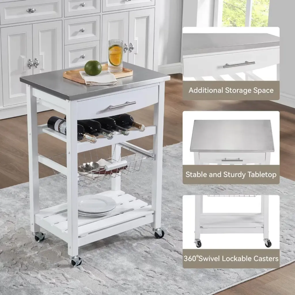 22.5"mobile Rolling Kitchen Island Trolley Serving Cart With Stainless Steel Top,underneath Drawer & Slide-out Wire Storage Basket,white