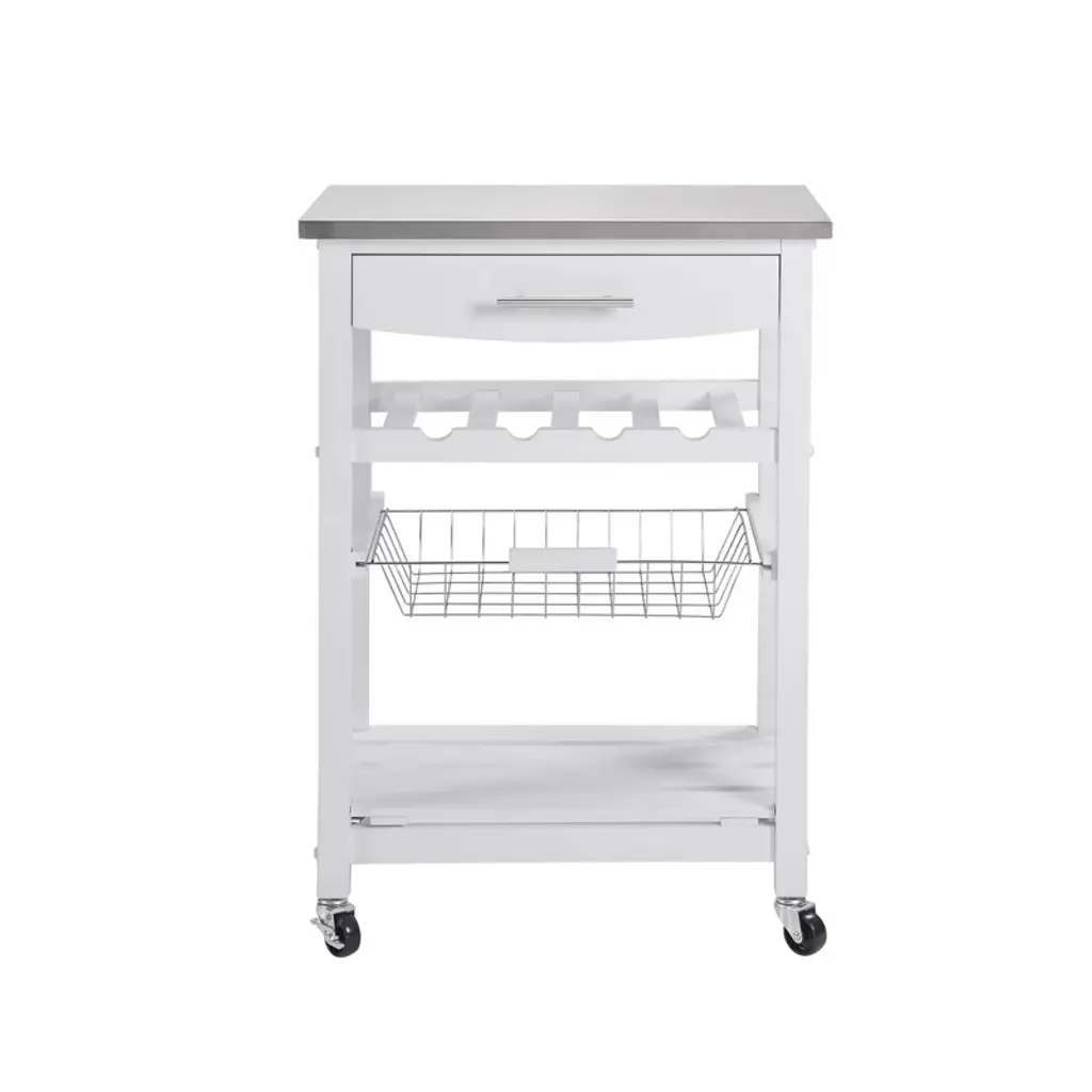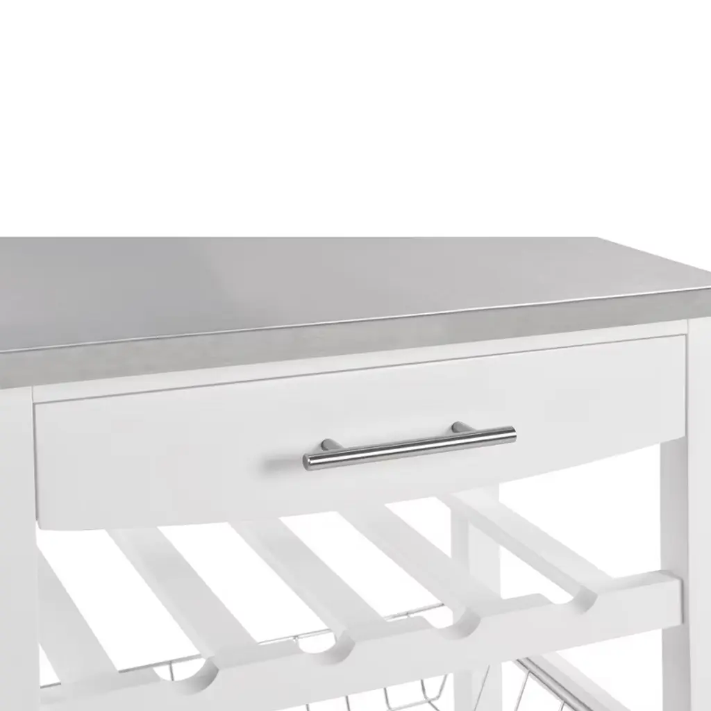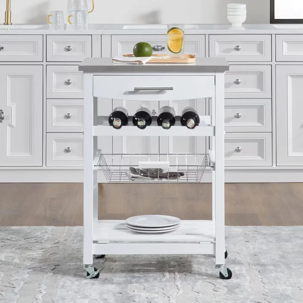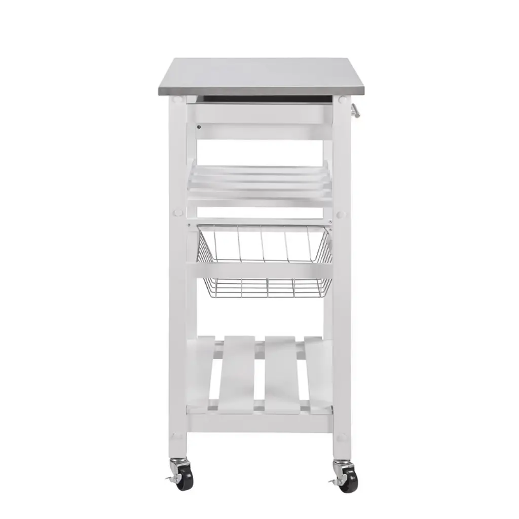 22.5"mobile Rolling Kitchen Island Trolley Serving Cart With Stainless Steel Top,underneath Drawer & Slide-out Wire Storage Basket,white