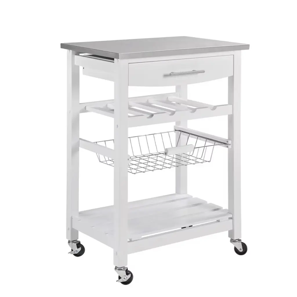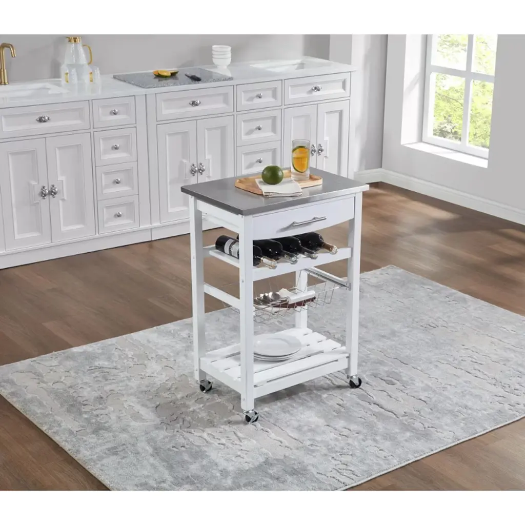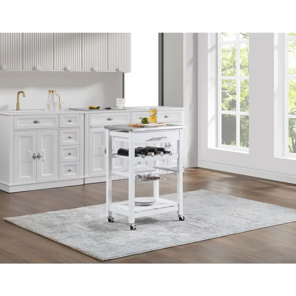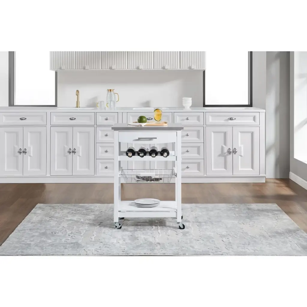 22.5"mobile Rolling Kitchen Island Trolley Serving Cart With Stainless Steel Top,underneath Drawer & Slide-out Wire Storage Basket,white