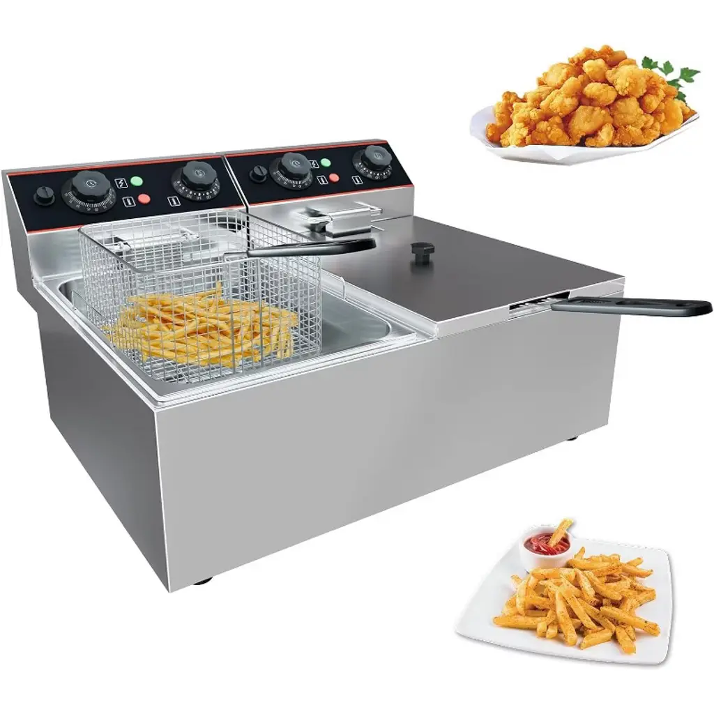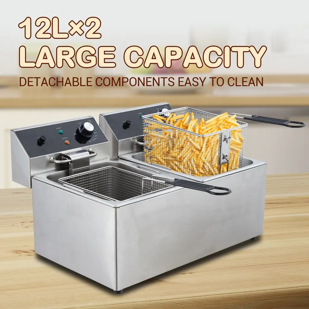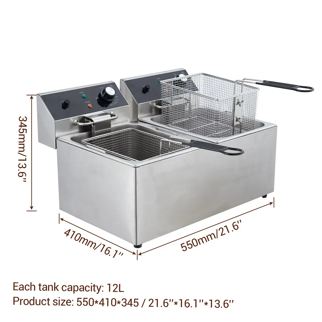 Indulge in your favorite American classics with this versatile deep fryer. From crispy fried chicken and golden shrimp to perfectly cooked French fries and chips, this electric deep fryer delivers delicious results every time.PROFESSIONAL-GRADE DEEP FRYER - Made of durable stainless steel, this deep fryer is suitable for both commercial and home use. Perfect for home occasions such as parties, movie nights, dinners, and family gatherings, and also ideal for commercial establishments such as restaurants, supermarkets, fast food stands, and snack bars.RAPID FRYING & USER-FRIENDLY OPERATION - The 1800-watt immersion-type element preheats and recovers oil temperature rapidly. U-shaped stainless steel heating tubes ensure even heat distribution. The temperature knob allows separate control of the tank, so you can select the ideal temperature for different types of food. Temperature Range: 50℃ - 200℃ (122℉ - 392℉).LARGE CAPACITY & FAMILY-SIZED - With a generous capacity of 12L/12.7QT per tank, this deep fryer is suitable for the whole family and commercial use, and is perfect for frying sweet and savory recipes, including chips, fish, chicken, doughnuts, fritters, onion rings, shrimp, and more.USER-CENTRIC DESIGN - The stainless steel lid cover prevents oil from splashing and safely covers the oil when the fryer is not in use. The fryer basket with a plastic handle prevents scalding of your hands and ensures safety. A residue plate is included for filtering out the dregs. The built-in overheating protection will automatically activate and cut off the power if the machine has been used for an extended period. What's more, each side has a power plug, which allows one to operate each side separately and fry different kinds of food at the same time. MAX power: 3600W (1800W for each plug).EASY TO CLEAN - The lid, fryer pot, basket, and housing are detachable for easy cleaning. The heating element can be removed for immersion in water, but should never be placed in a dishwasher. It's important to ensure that the electric unit does not get wet.