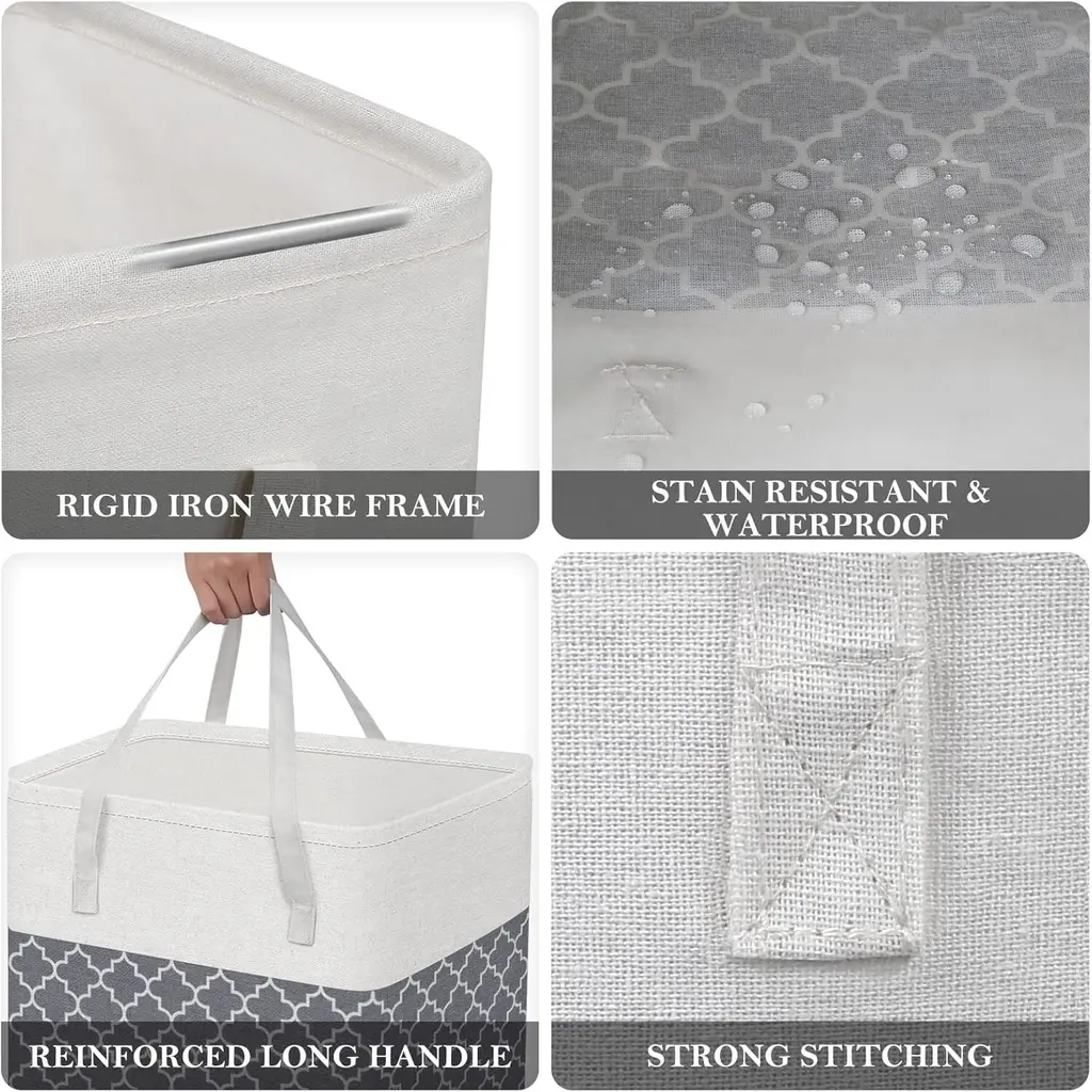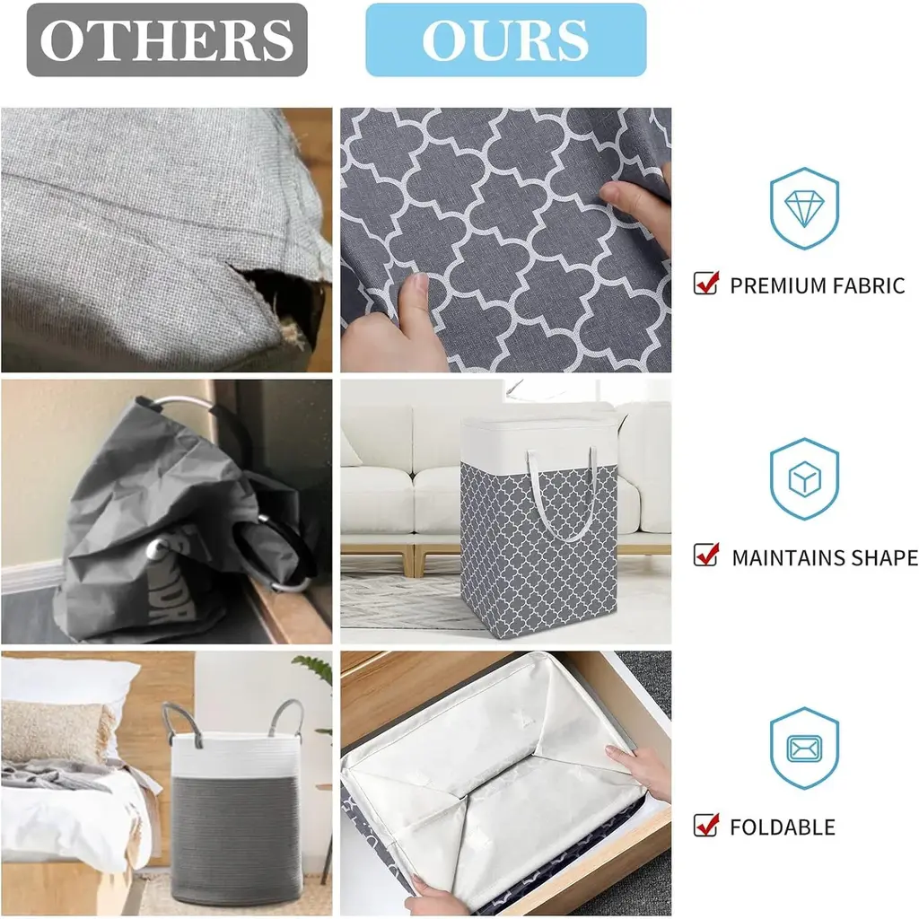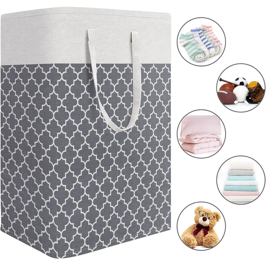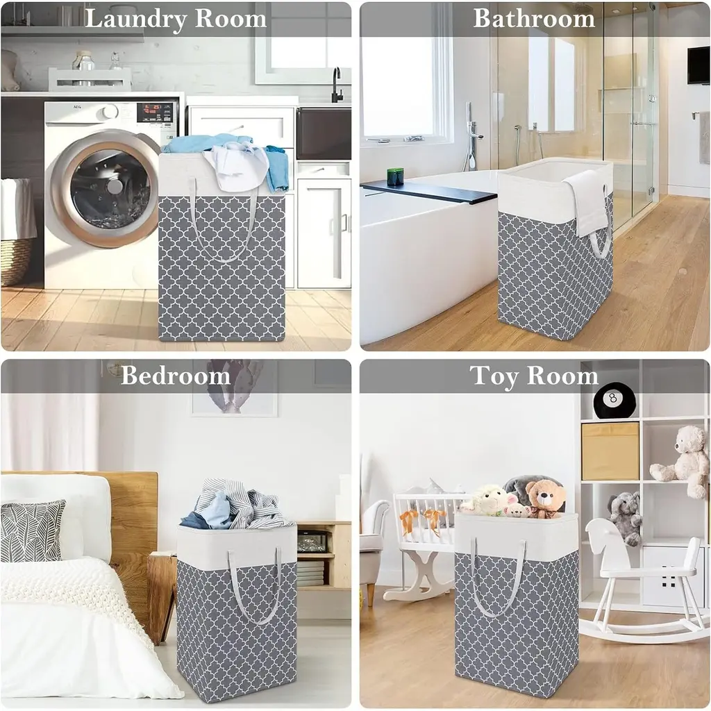 [High-quality Double-layer Fabric] laundry baskets are hard-wearing and attractive; made of high-quality cotton and linen double-layer fabrics. The stitching is very delicate, yet strong and soft to the touch. The smooth waterproof inside coating ensures that the hamper stays dry and prevents unpleasant odors.Just wipe off the dirt with a wet sponge or cloth or rinse with cold water. Do not wash in the washing machine or dryer. [Freestanding Laundry Basket]The rigid wire rack on the top of the tall laundry basket keeps the basket upright, even when empty. [Reinforced Long Handle]The long handles on each side of the laundry basket make it easy to carry the large laundry hamper with one or both hands. The handle is tightly stitched with sturdy needlework to carry even heavy loads without tearing. [Large Capacity]The clothes bin measures 15.7"*11.8"*24.4" (length*width*height) and the capacity is 75L. Such a tall storage basket can store dirty clothes, pillows, quilts and blankets. It is suitable for university dormitories and camping, or for travelers, apartments, hotels, baby nurseries, utility rooms and shopping. [Laundry Basket Collapsible]The collapsible laundry hamper folds flat for easy storage in drawers, closets or narrow corners. The lightweight material is easy to carry and fits in a suitcase for travel.