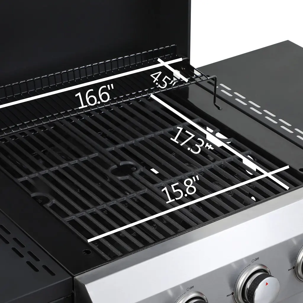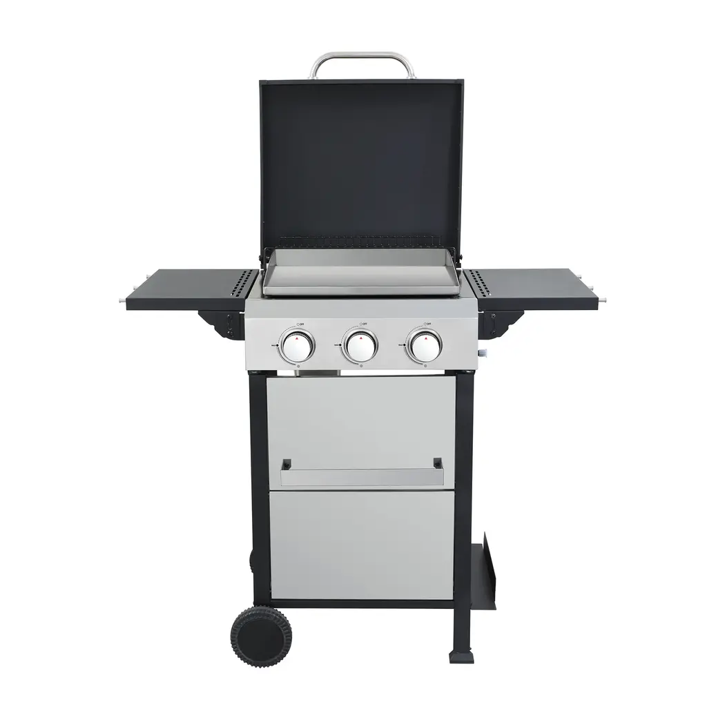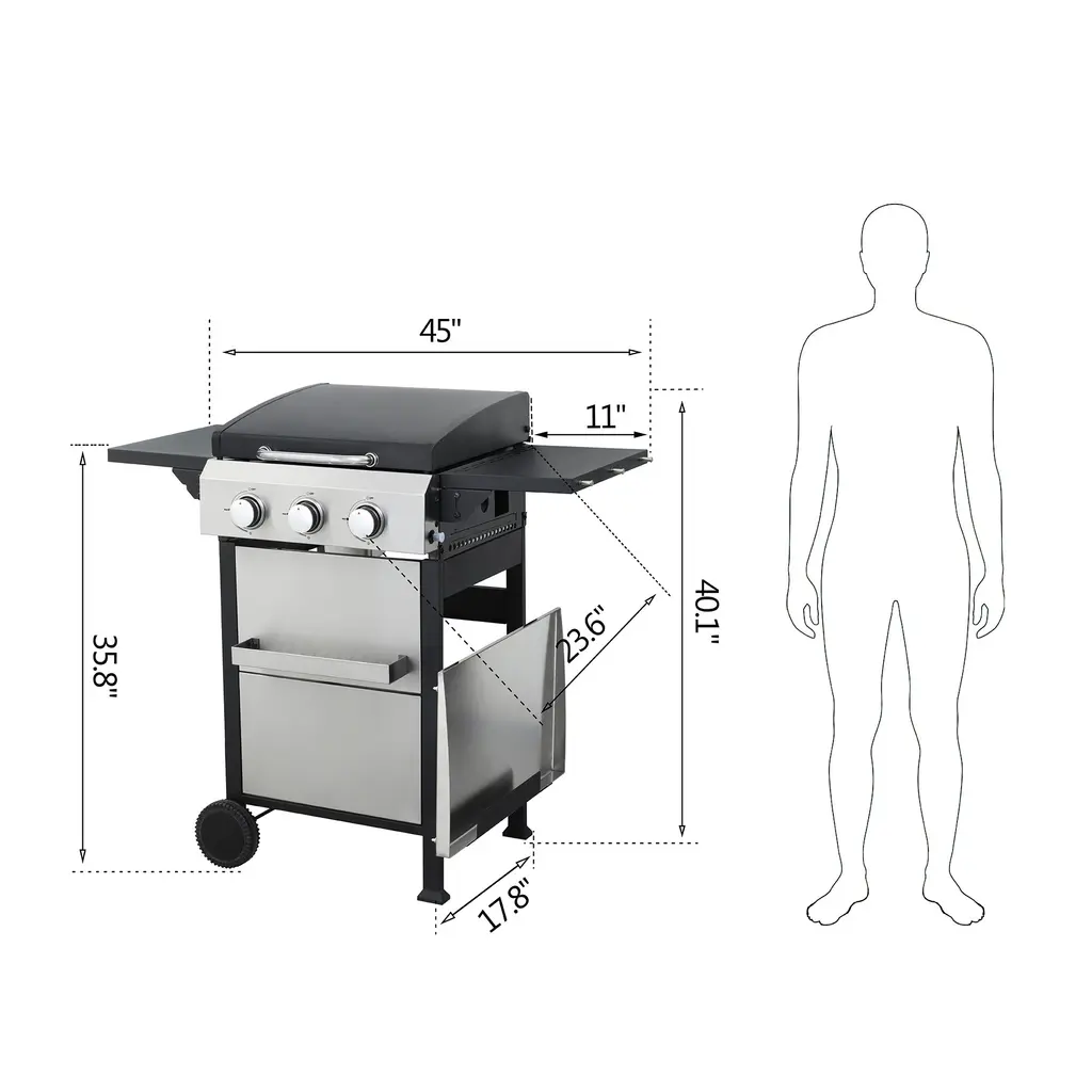 3-Burner Propane Gas Bbq Grill, Ss Plancha,output With Wire Enamel Cooking Grids, Foldable Side Table, Hanging Basket - Propane Gas - Silver/black