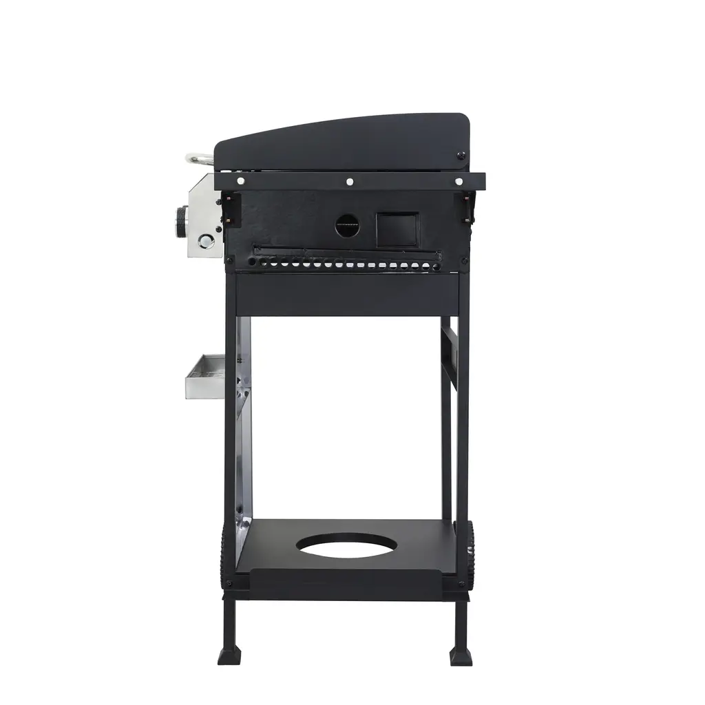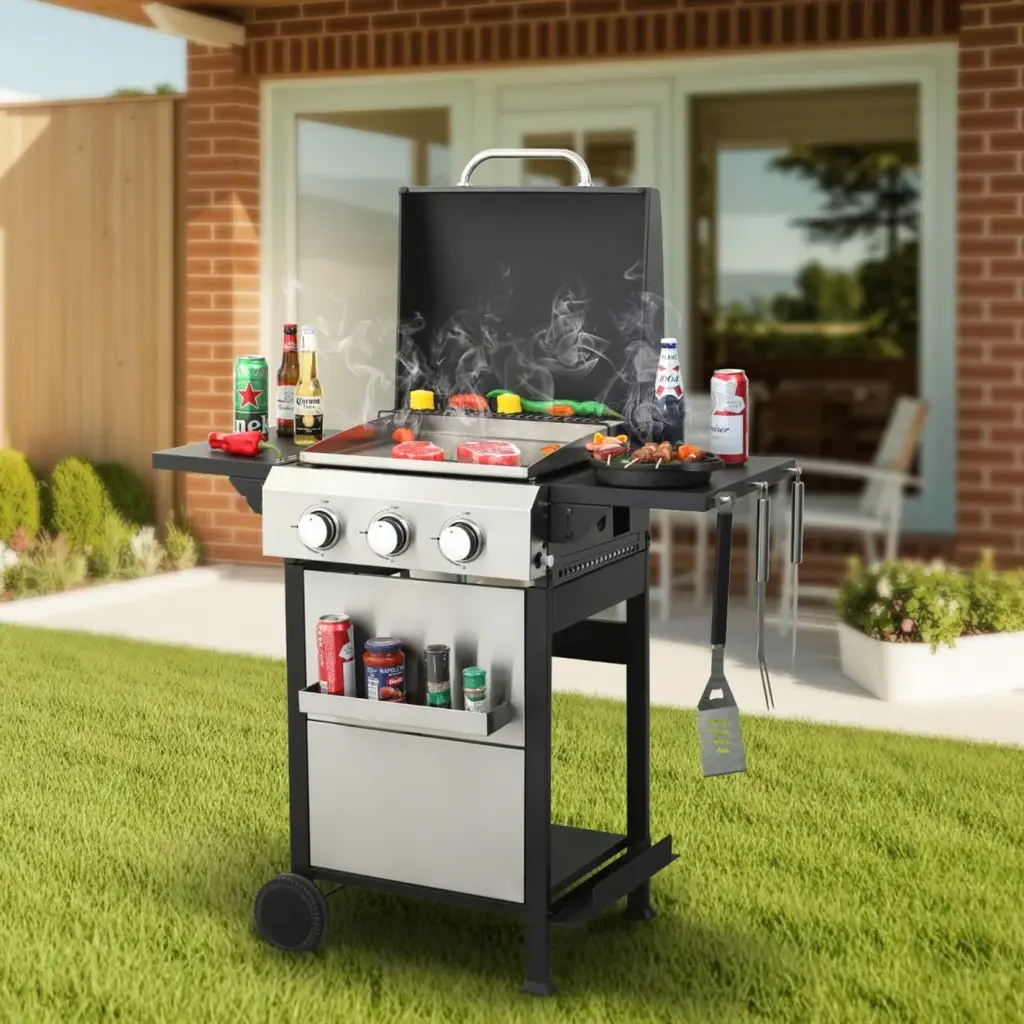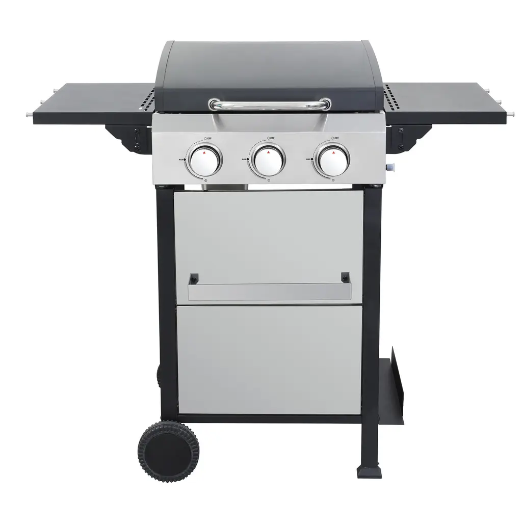 3-Burner Propane Gas Bbq Grill, Ss Plancha,output With Wire Enamel Cooking Grids, Foldable Side Table, Hanging Basket - Propane Gas - Silver/black
