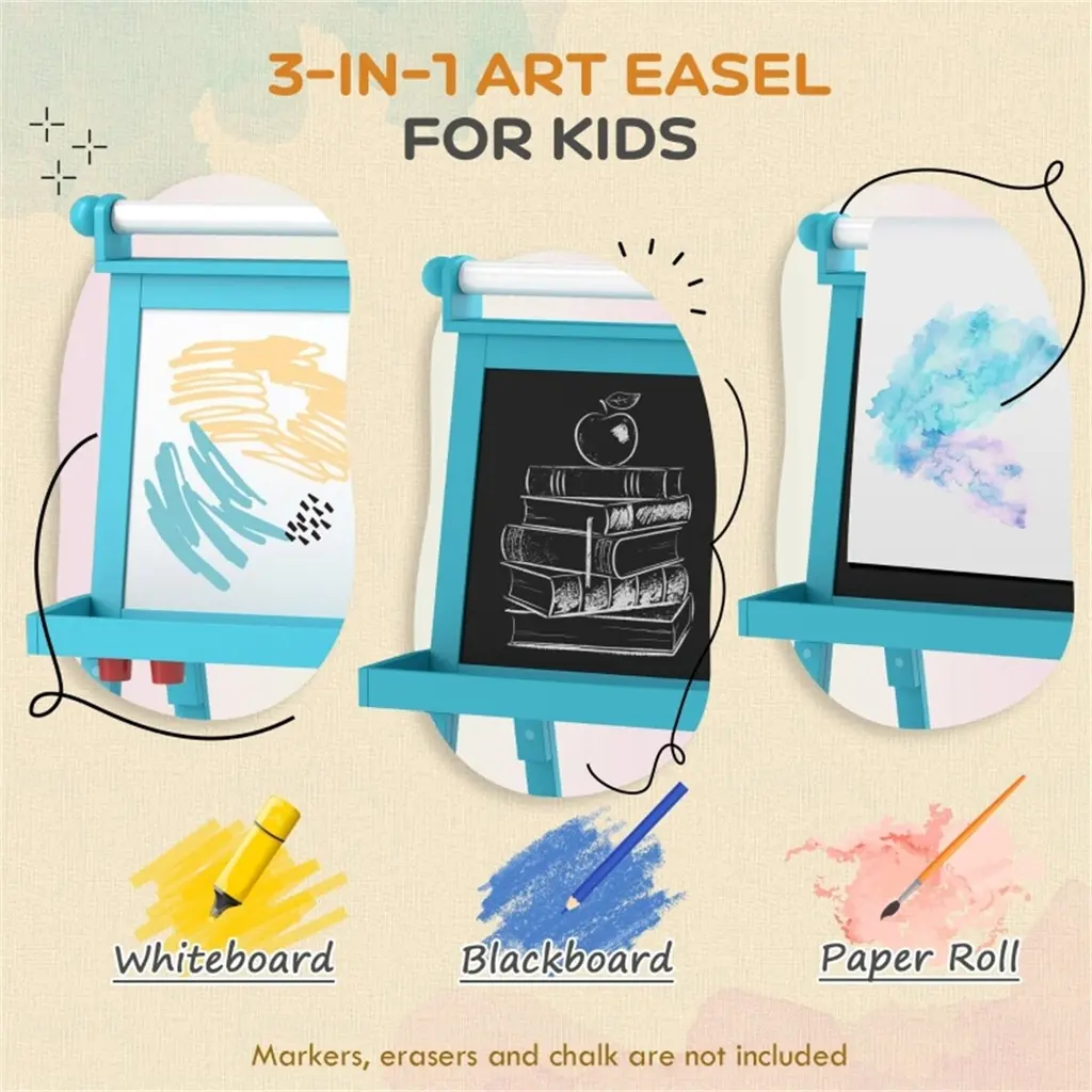 Specification:Description:This versatile kids' easel offers a 3-in-1 design, perfect for painting, writing, and drawing, making it ideal for creative young minds. The easel features a large paper roll for easy access to fresh drawing space, two brush pots, and holders for quick and convenient paint use. With two storage baskets to keep art supplies organized, it ensures a tidy and efficient workspace. Constructed with a stable A-frame and durable MDF material, this easel provides a safe environment for children aged 3 and up. The overall dimensions of 23.2" W x 18.9" D x 46.5" H, with additional features like a board size of 22" W x 18.7" H, make it the perfect addition to any art-loving child's room. Assembly is required, and the package includes a paper roll, storage boxes, and a manual. Please note that markers, erasers, and chalk are not included.Key Features: