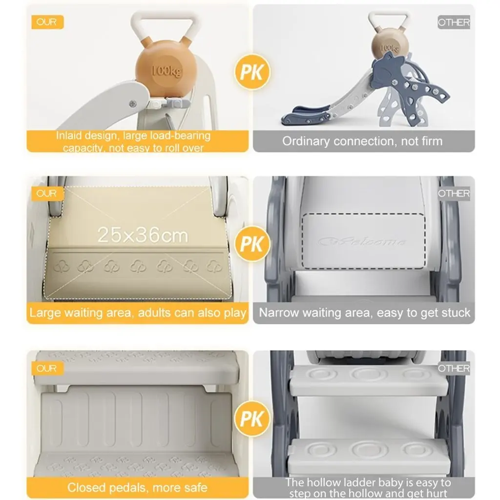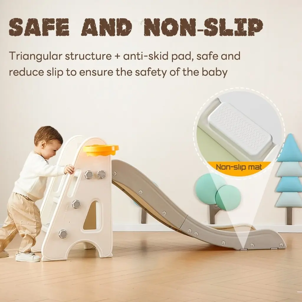 Unparalleled Stability: Experience unmatched stability with features like anti-slip padding, our toddler slide is a guardian of your child's joyful escapades. Vibrant Playmate: Crafted with a safety embrace for smooth glides, the frame's basketball hoop is like a cheering buddy. Infusing glee and security, it unlocks energetic play, kindling athletic potential, and guiding kids on a secure, exhilarating journey on your indoor playground. Sculpted Elegance for Your Home: Elevate your haven with our kids slide carefully sculpted elegance, turning your space into a canvas of shared adventures. Eco-Conscious Design: Crafted from environmentally-friendly HDPE material, our slide ensures both safety and sustainability. Just like a nature's protector, it lets your child play responsibly and joyfully. Threads of Love, Woven in Play: Weave threads of love as you join in the play, strengthening the tapestry of connections between you and your little ones. Two patterns: One with a penguin pattern and the other one with a geometric pattern.