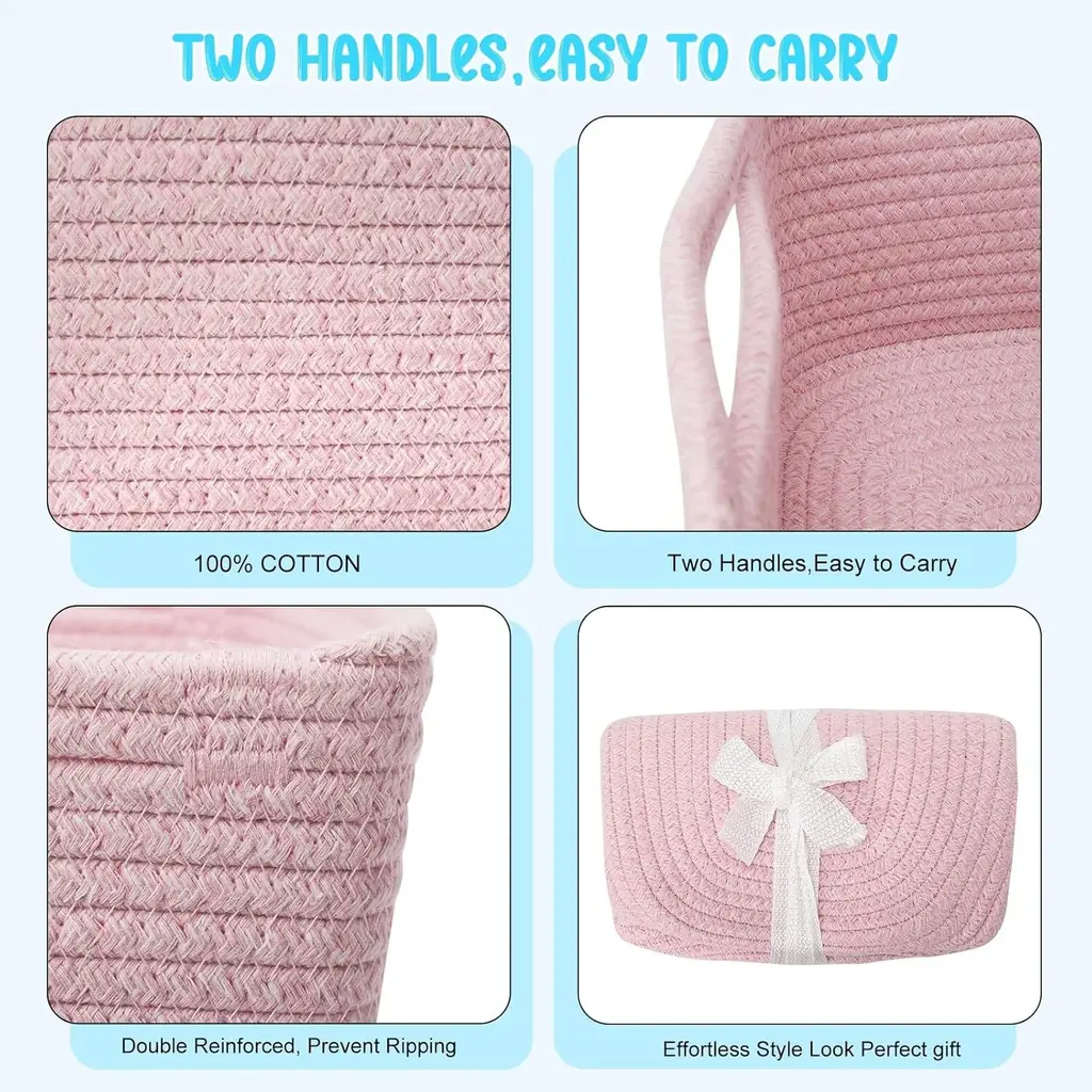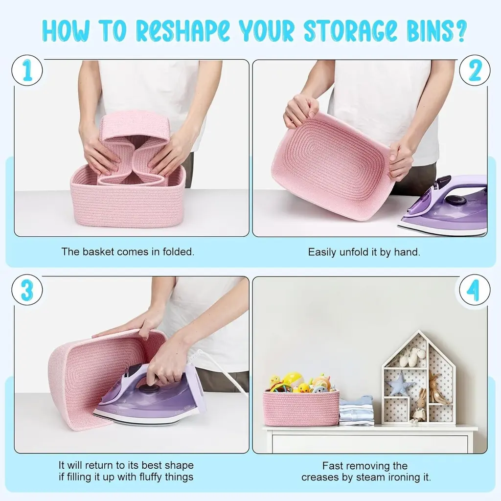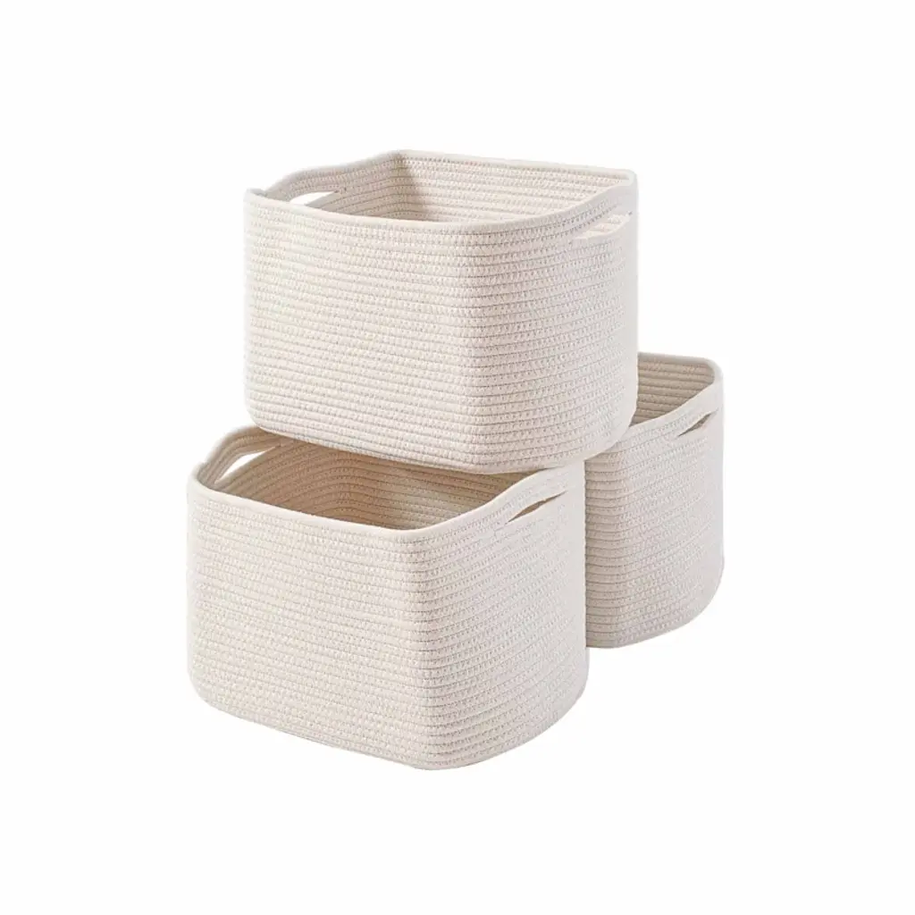 【Basket Organizer】:The size of woven rope basket is 11.81 * 7.87 * 5.12Inches.One basket can hold 7-8 books, 4 pairs of pants, 3 thin baby blankets, 10 baby diapers, wet wipes, and a certain number of baby toys, etc. We provide 3 baskets, enough capacity to store your items. 【No visible creases】:We use the latest materials, if you follow the steps we provide, the crease will disappear(If there are still creases, Fill the basket with towels or clothes and wait 1-2 days to reshape the basket. Steam or ironing can also reshape the basket.) 【Soft and Durable】: Our shelf basket is hand-woven by skilled artisans using high-quality natural cotton rope that's ultra-soft and durable. No odor or sharp corners, making it safe for babies. Ideal for nurseries and playrooms 【Reinforced Hidden Handles】This cute square rope basket designed with seamless look handles, you'll be the Houdini of home organizing. This basket is perfect for all kinds of gift storage, for example, You can use it as a baby gift basket,birthday gift basket,Easter and Christmas gift basket ,house warming gifts basket.
