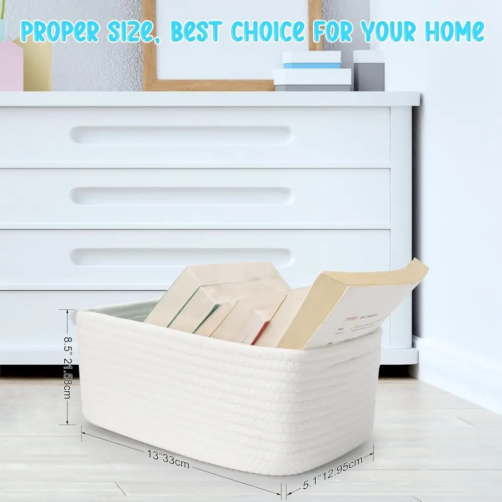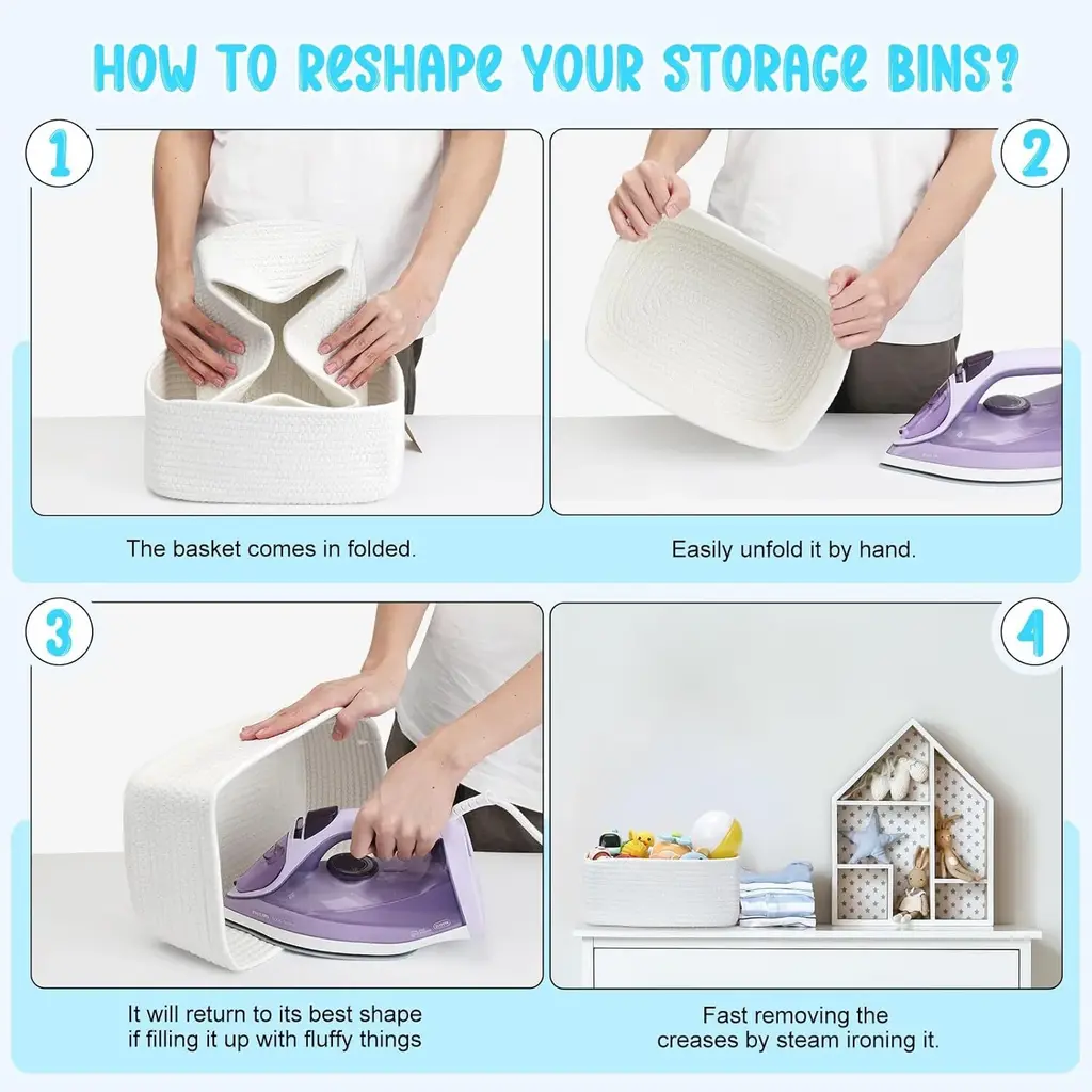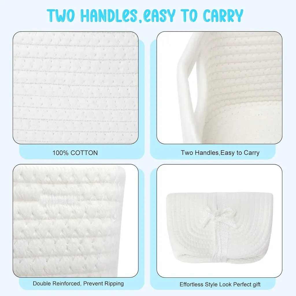 【Basket Organizer】:The size of woven rope basket is 11.81 * 7.87 * 5.12Inches.One basket can hold 7-8 books, 4 pairs of pants, 3 thin baby blankets, 10 baby diapers, wet wipes, and a certain number of baby toys, etc. We provide 3 baskets, enough capacity to store your items. 【No visible creases】:We use the latest materials, if you follow the steps we provide, the crease will disappear(If there are still creases, Fill the basket with towels or clothes and wait 1-2 days to reshape the basket. Steam or ironing can also reshape the basket.) 【Soft and Durable】: Our shelf basket is hand-woven by skilled artisans using high-quality natural cotton rope that's ultra-soft and durable. No odor or sharp corners, making it safe for babies. Ideal for nurseries and playrooms 【Reinforced Hidden Handles】This cute square rope basket designed with seamless look handles, you'll be the Houdini of home organizing. This basket is perfect for all kinds of gift storage, for example, You can use it as a baby gift basket,birthday gift basket,Easter and Christmas gift basket ,house warming gifts basket.