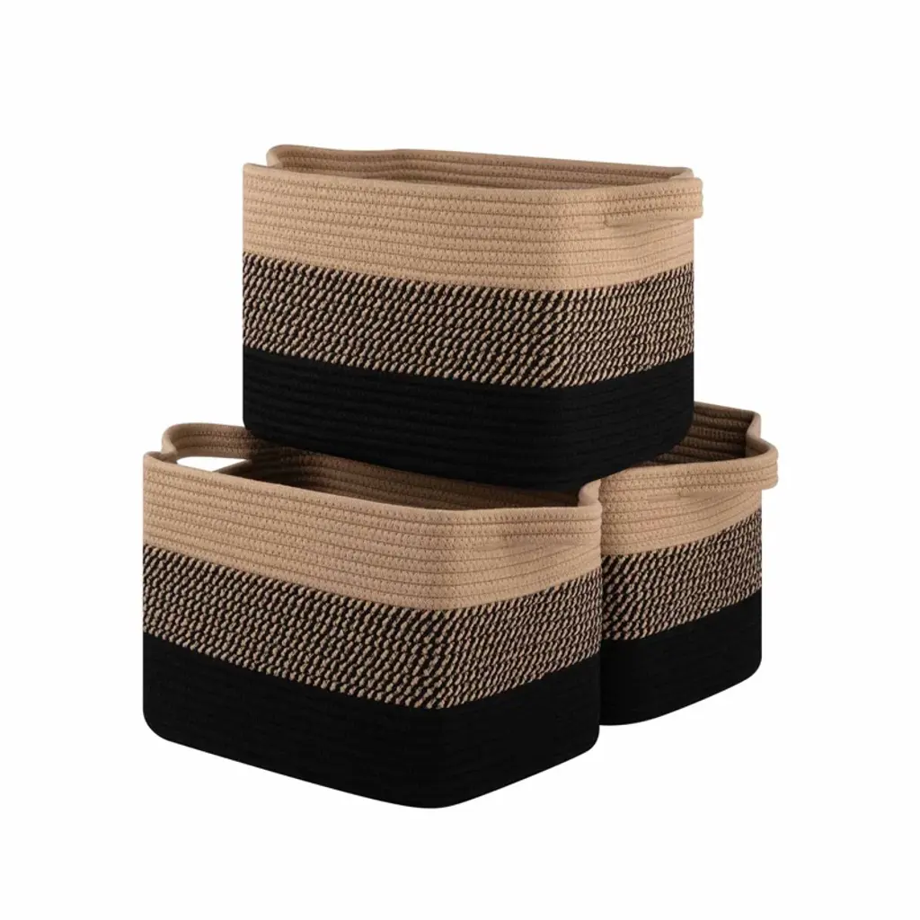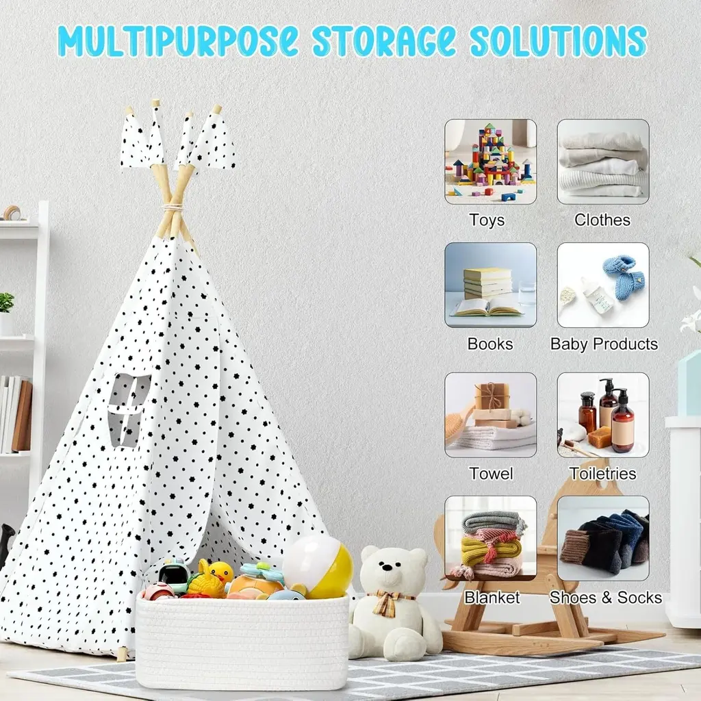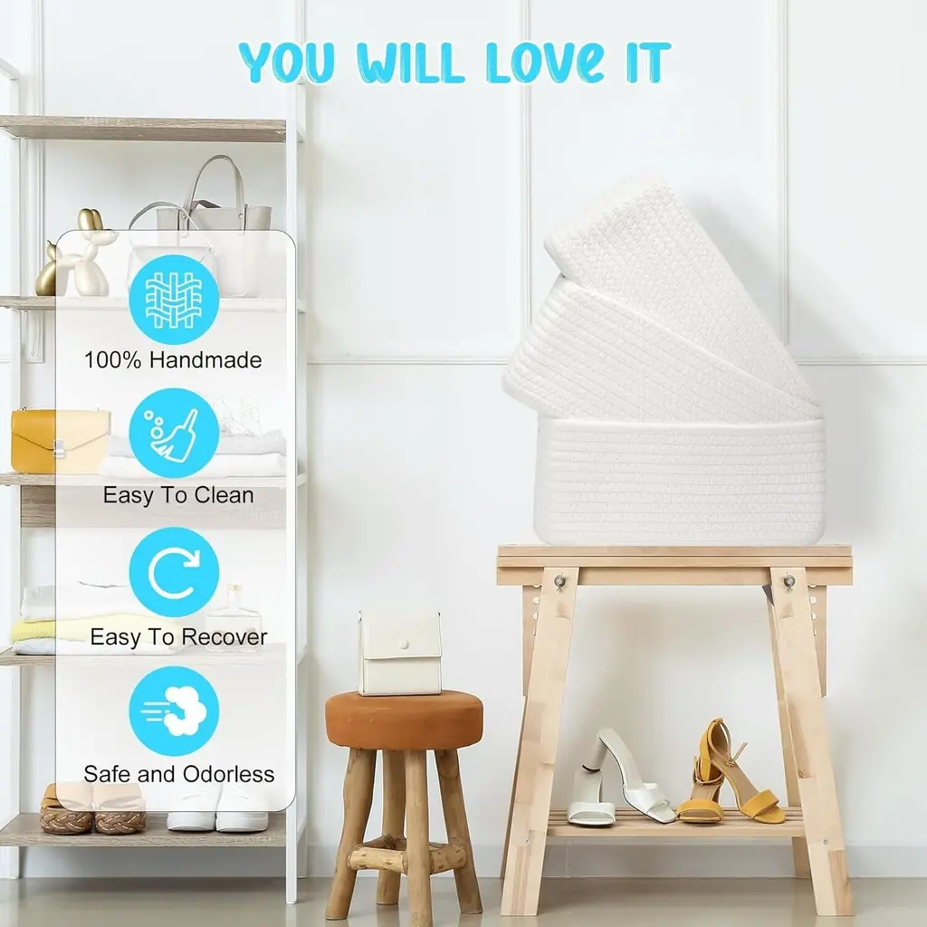 【Basket Organizer】:The size of woven rope basket is 11.81 * 7.87 * 5.12Inches.One basket can hold 7-8 books, 4 pairs of pants, 3 thin baby blankets, 10 baby diapers, wet wipes, and a certain number of baby toys, etc. We provide 3 baskets, enough capacity to store your items. 【No visible creases】:We use the latest materials, if you follow the steps we provide, the crease will disappear(If there are still creases, Fill the basket with towels or clothes and wait 1-2 days to reshape the basket. Steam or ironing can also reshape the basket.) 【Soft and Durable】: Our shelf basket is hand-woven by skilled artisans using high-quality natural cotton rope that's ultra-soft and durable. No odor or sharp corners, making it safe for babies. Ideal for nurseries and playrooms 【Reinforced Hidden Handles】This cute square rope basket designed with seamless look handles, you'll be the Houdini of home organizing. This basket is perfect for all kinds of gift storage, for example, You can use it as a baby gift basket,birthday gift basket,Easter and Christmas gift basket ,house warming gifts basket.