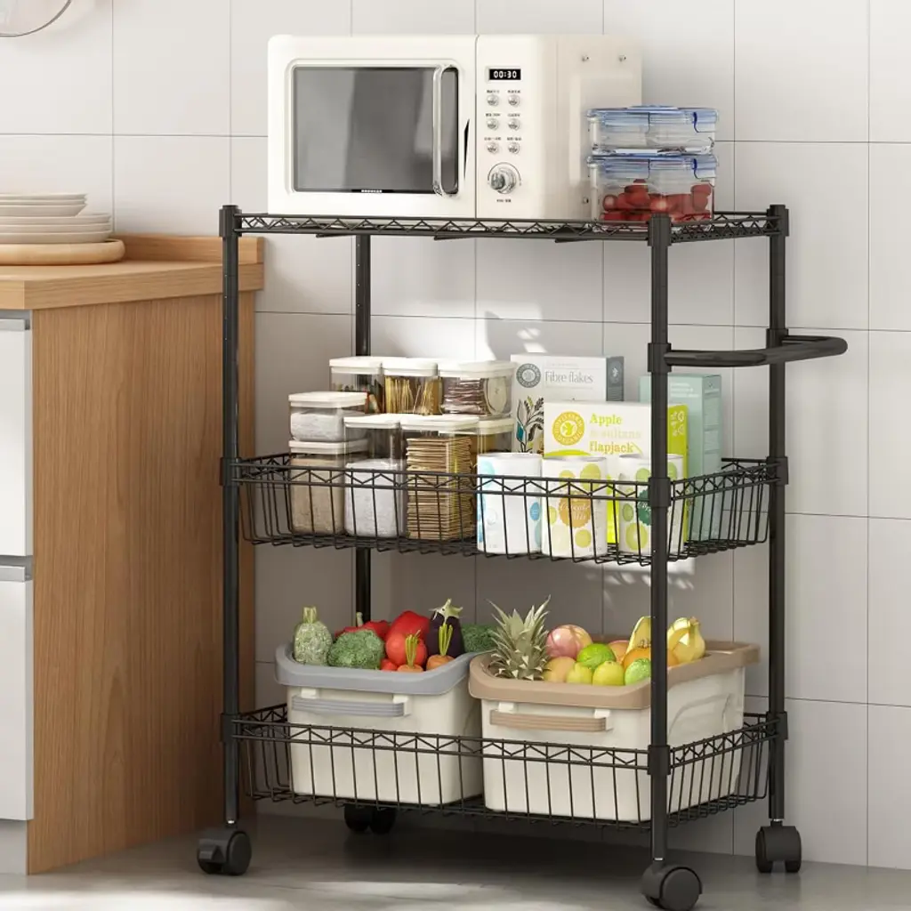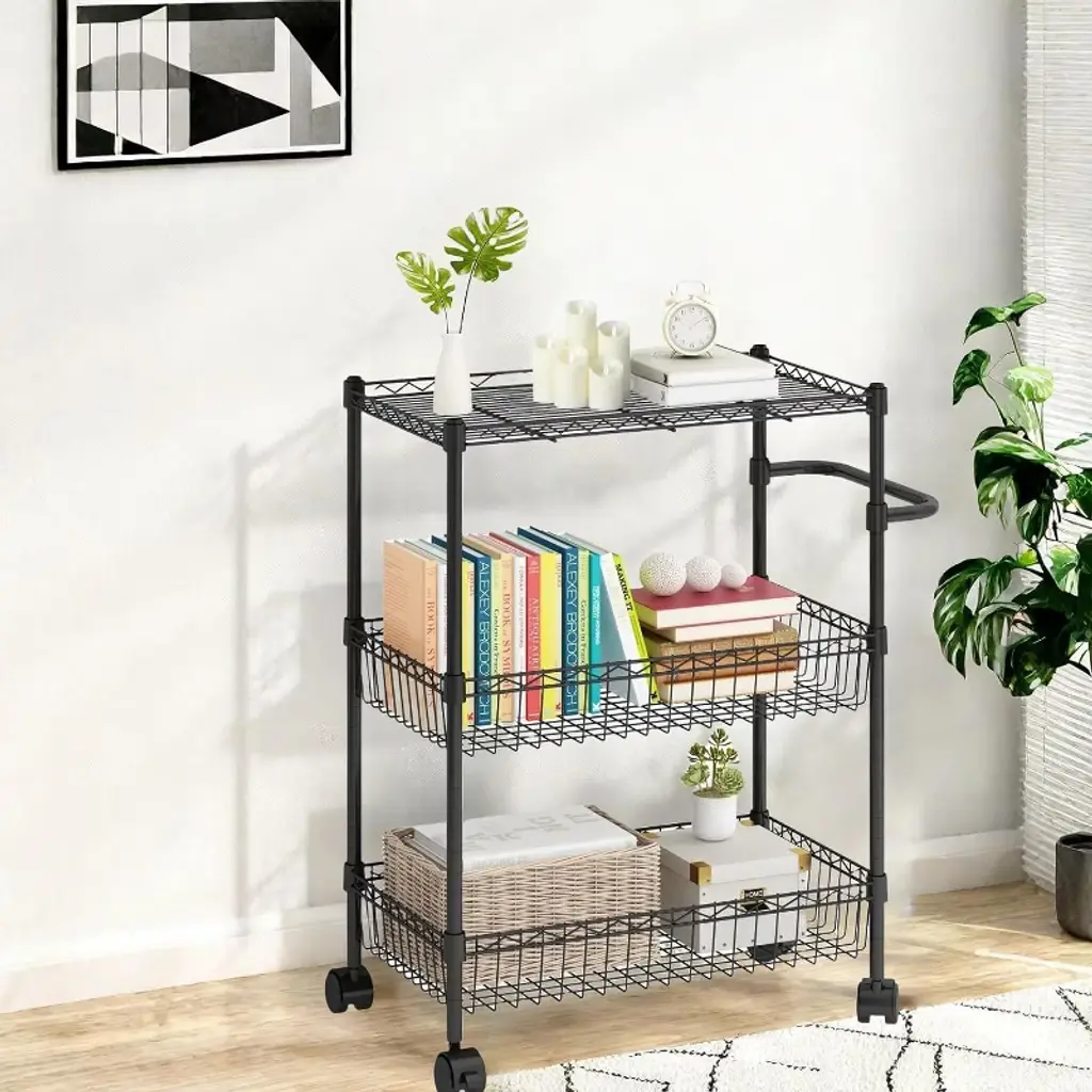 3 Tier Wire Utility Cart With Handle And Adjustable Basket, Kitchen Cart With Metal Wheels, Utility Storage Rack, Black