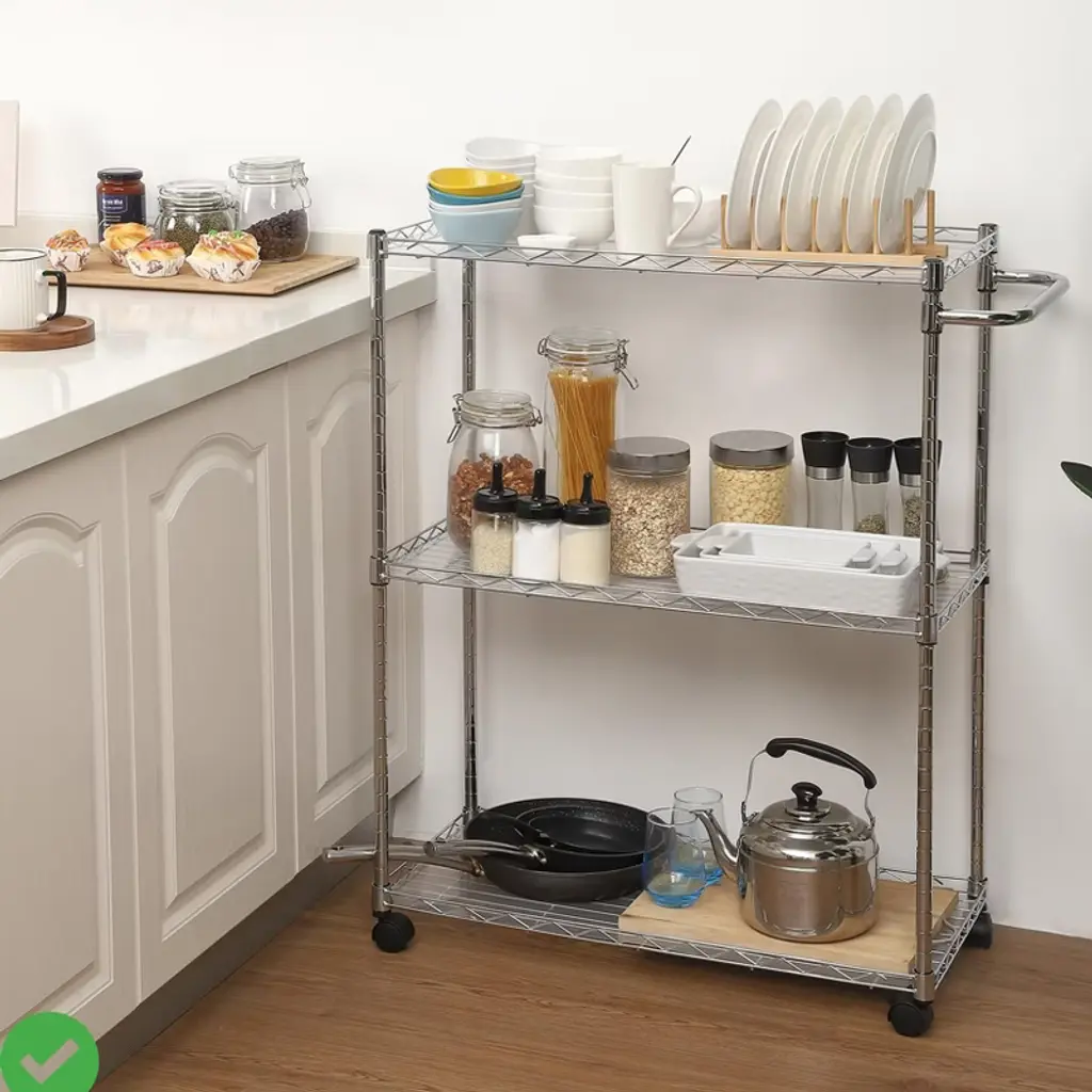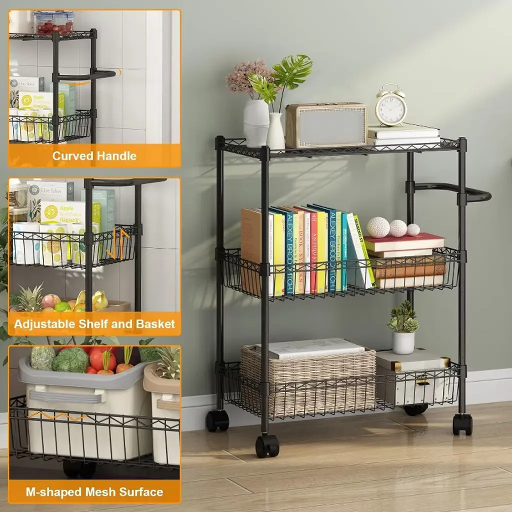 With its flexible adjustable storage and easy to move design, this cart is ideal for home and work. Featuring two adjustable baskets and one adjustable shelf, the storage layout can be customised to suit your needs, whether it's for kitchen utensils or office supplies, helping to efficiently organise your belongings and keep your space in order. With two of the four 360-degree swivel wheels with brakes to ensure smooth movement on different surfaces and a firm hold, the three-tier rolling storage trolley is perfect for transporting items from room to room, providing a convenient use experience and making lifting easier and more efficient.Built with high quality carbon steel material, it has a weight capacity of up to 110lbs to ensure strength and long-lasting durability, whether for daily use or heavy duty tasks, it can carry them steadily and become a reliable partner in home life, providing long-lasting use guarantee. Perfect for kitchen, bathroom, living room, laundry room or office, whether it's for storing fruits and vegetables, books or decorations, it seamlessly blends into any environment and meets diversified storage needs, adding practicality and aesthetics. Tool-free assembly design takes only 10-15 minutes to complete, the process is simple and quick, no need to face complicated instructions or hardware, quickly organise your space, instantly enjoy neatness and convenience.